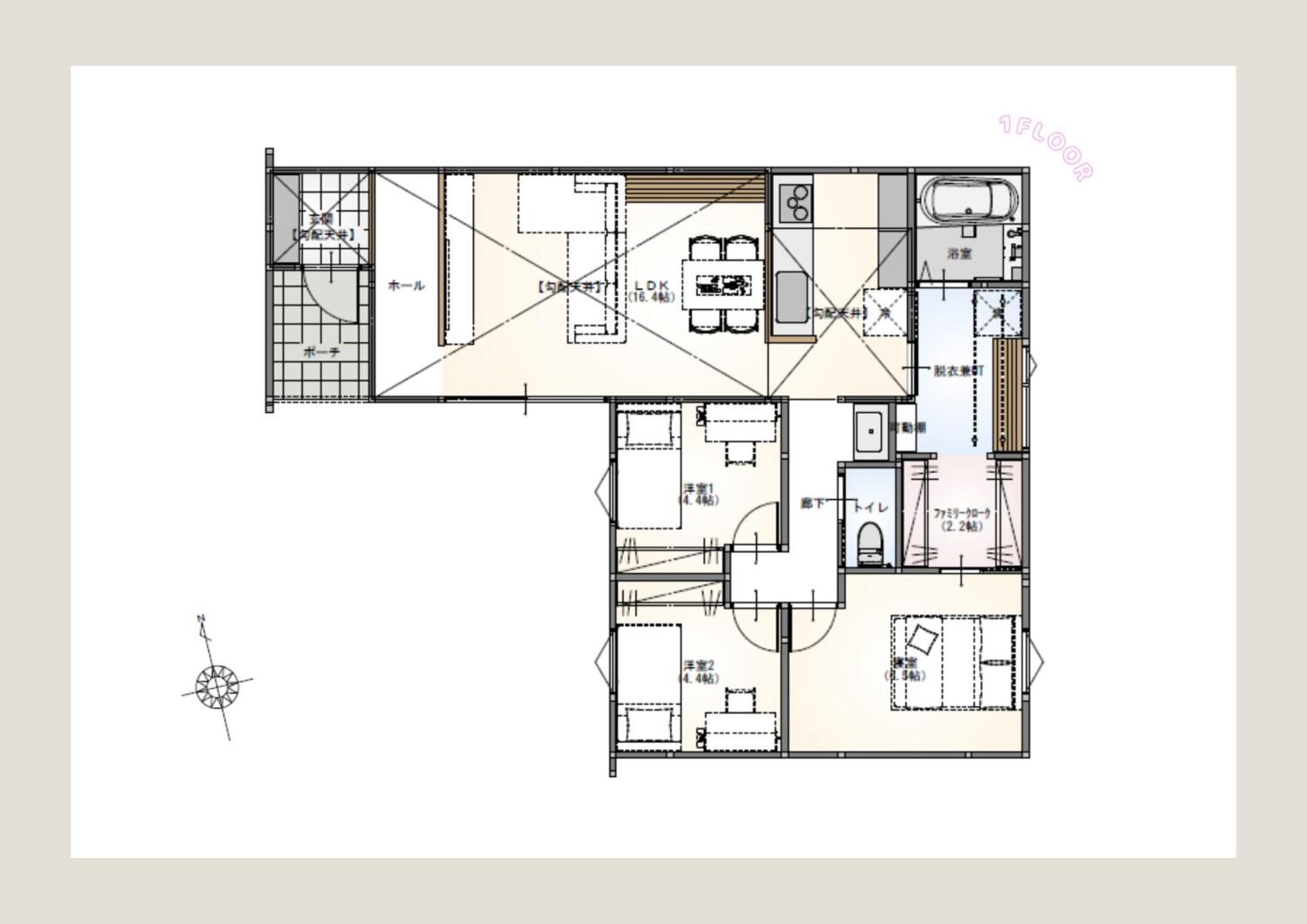 | POINT | 陽の光がたっぷり差し込むリビングと勾配天井で、コンパクトながら開放感のある空間に。 ”心地よいサイズ感”の平屋をご提案。 |