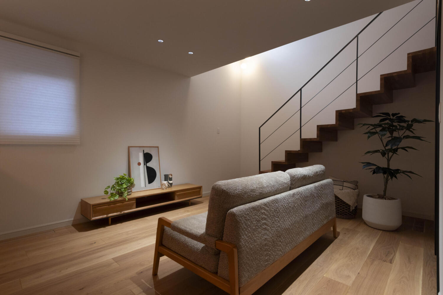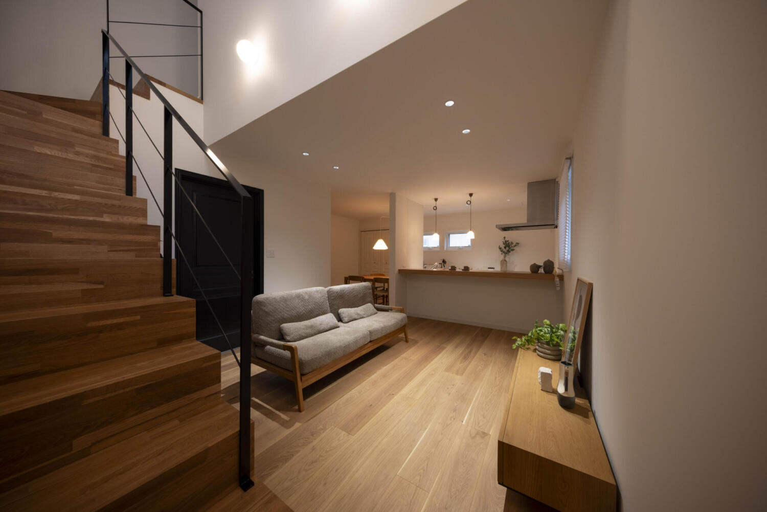 - キッチンには造作カウンターを設置。昼は家族との自然な会話を楽しむ場所、夜はまるでプライベートバーのようにグラスを傾けながら本を読んだり心地よい静けさの中でひと息つく、上質なひとときが広がります。