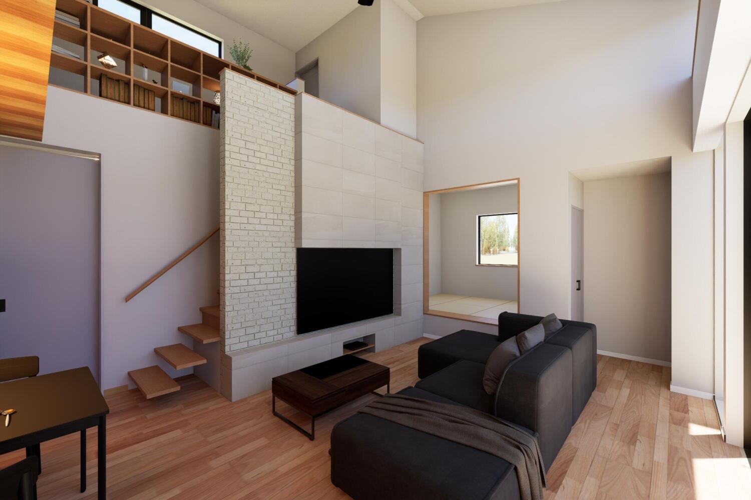 - 吹抜けが生み出す、ひときわ開放的なリビング空間。