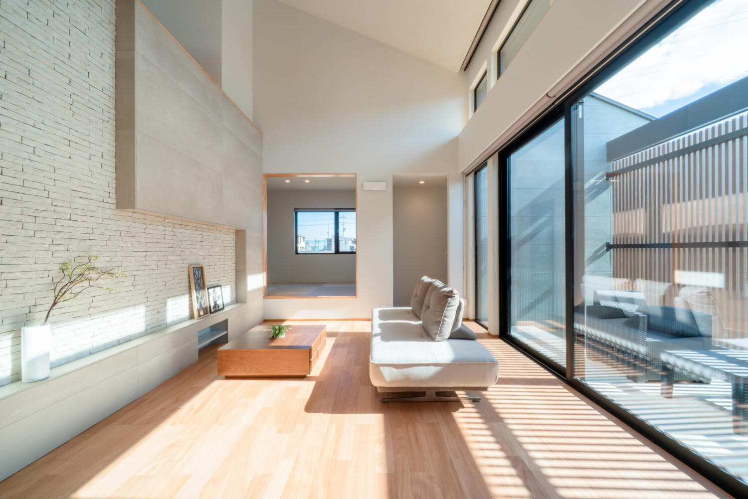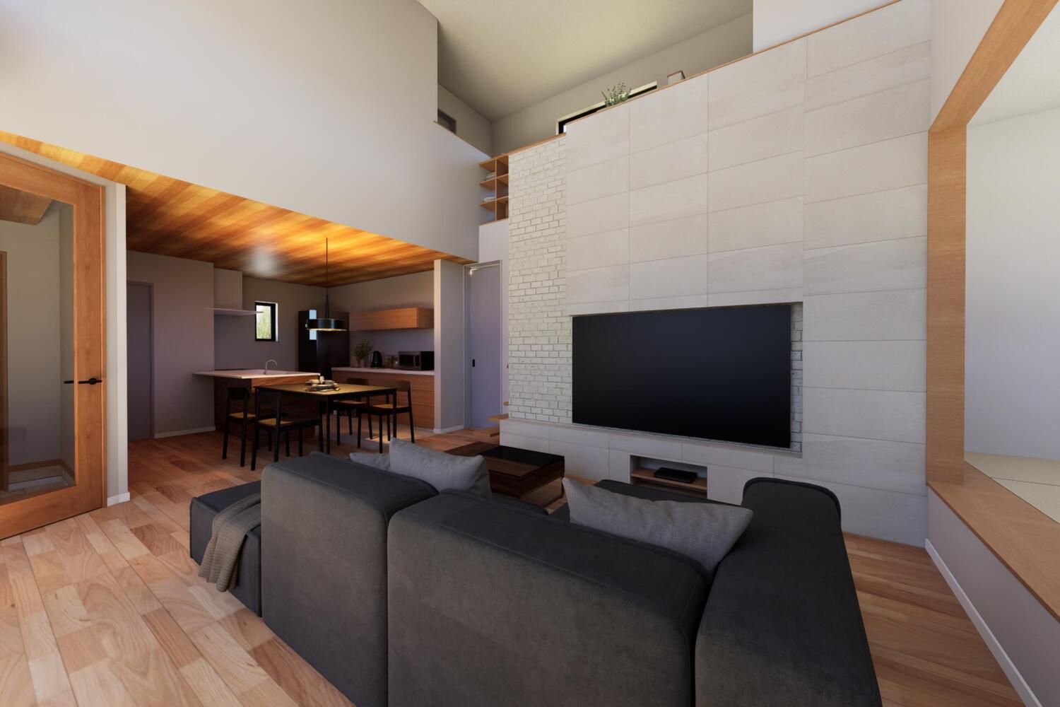 - リビングの主役となるのは、テレビ背面に設えた白の石目調アクセントウォール。