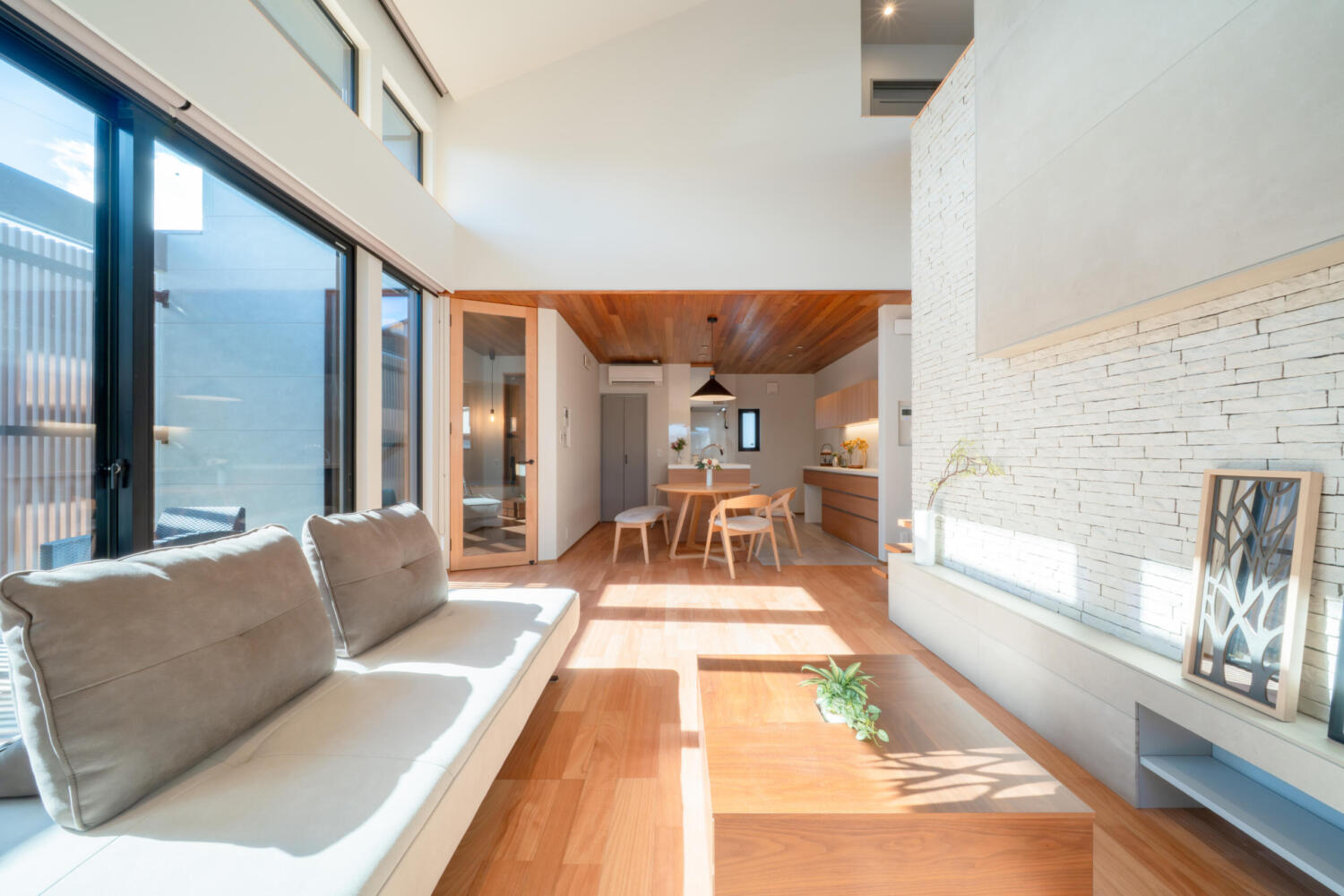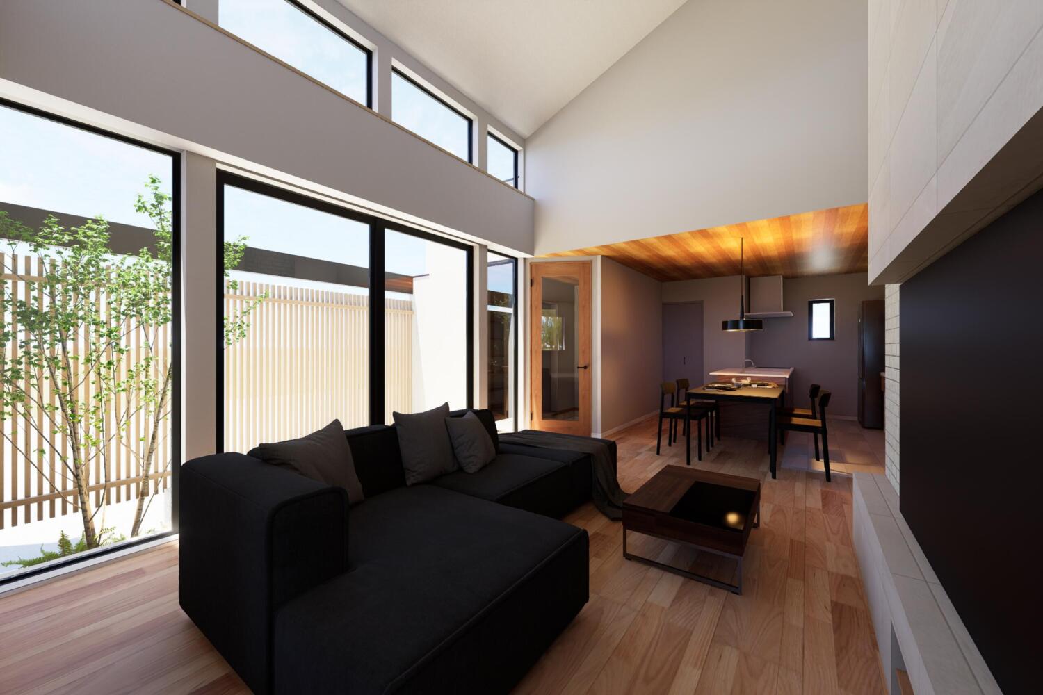 南面に設けた大きな窓からは、やわらかな陽光がたっぷりと差し込み、時間帯によって表情を変える明るさと心地よさを感じられます。