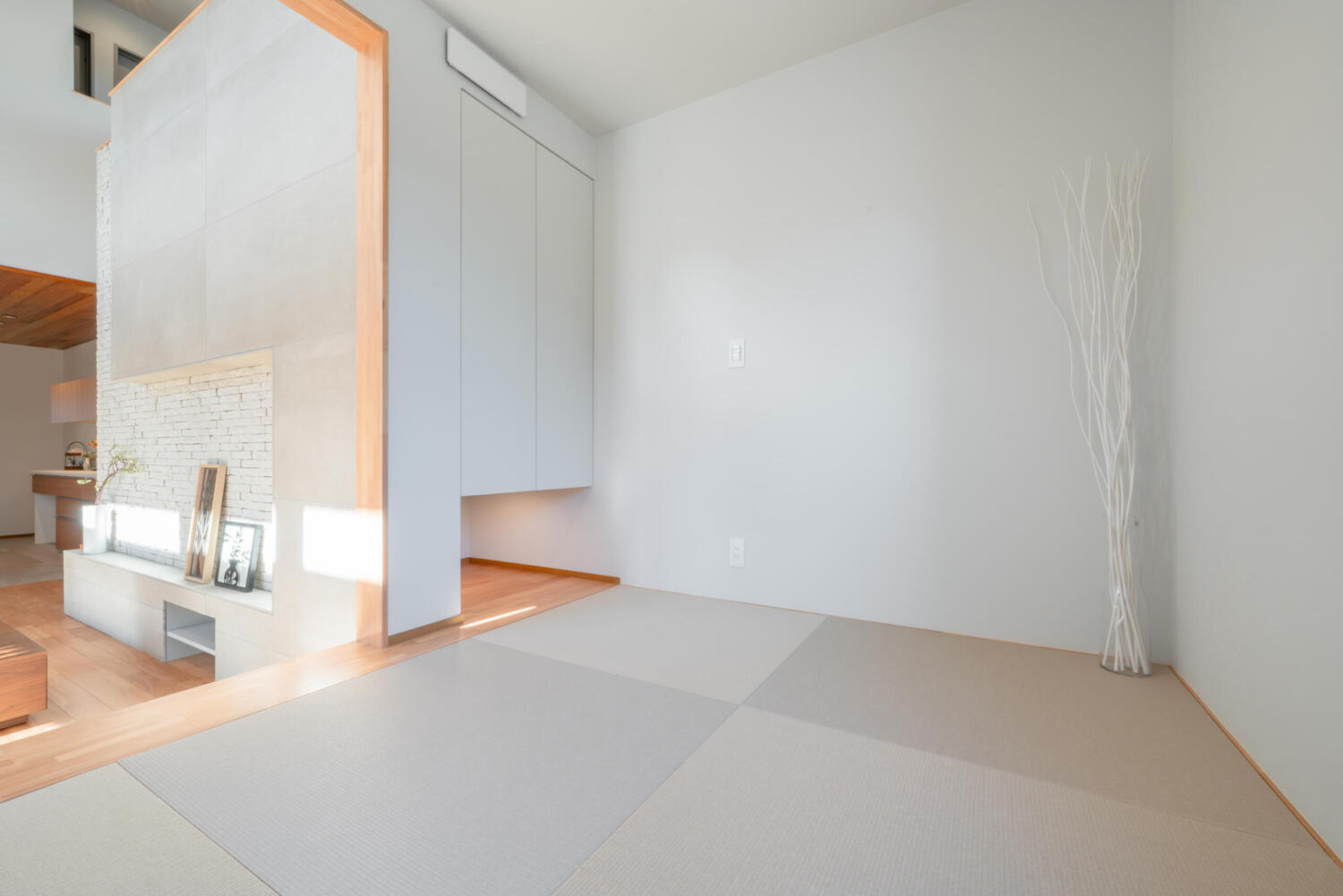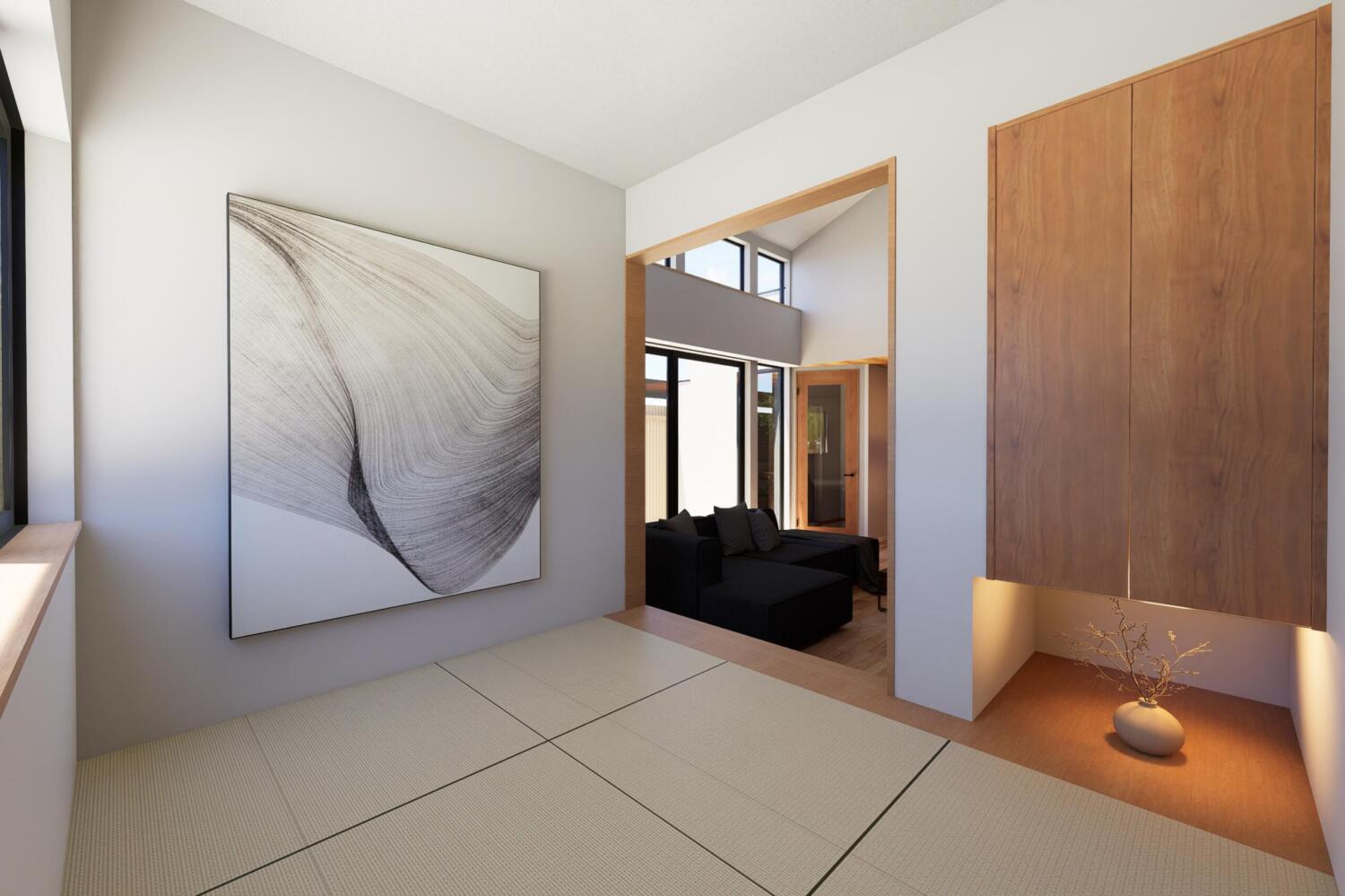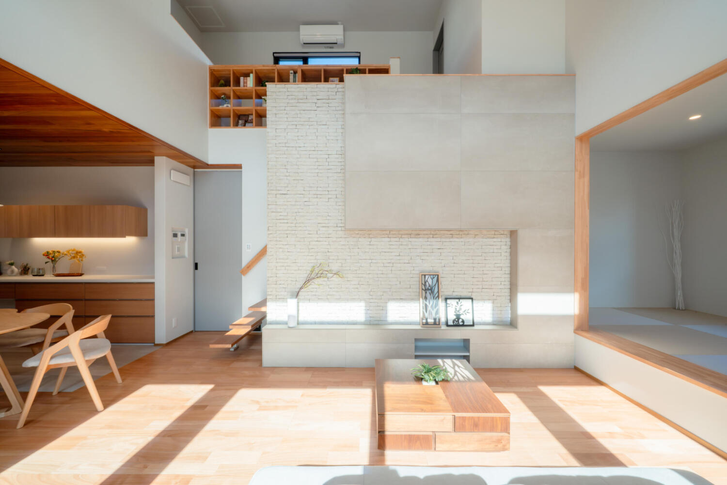 - 小上がりの和室や下がり天井を採用したキッチンスペースなど、空間を“縦”に使った設計が印象的なモデルハウス。