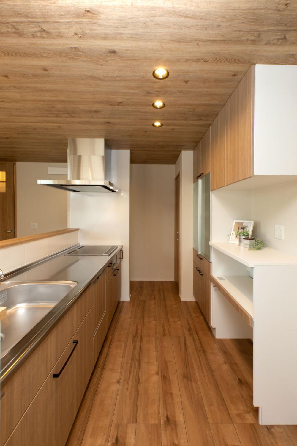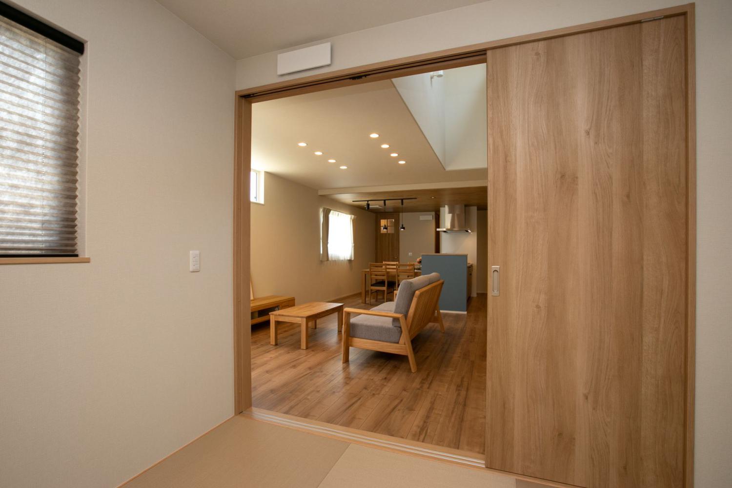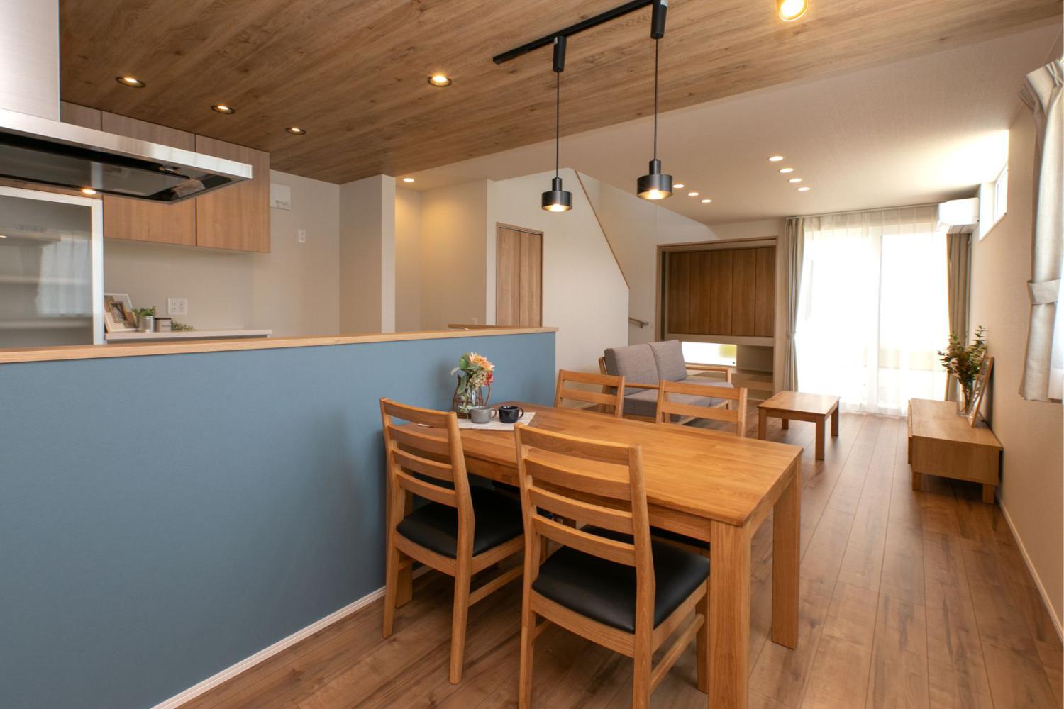 住宅街の中でも採光のとれるよう、吹き抜けを設けた開放感のある明るいリビングが特徴です◎