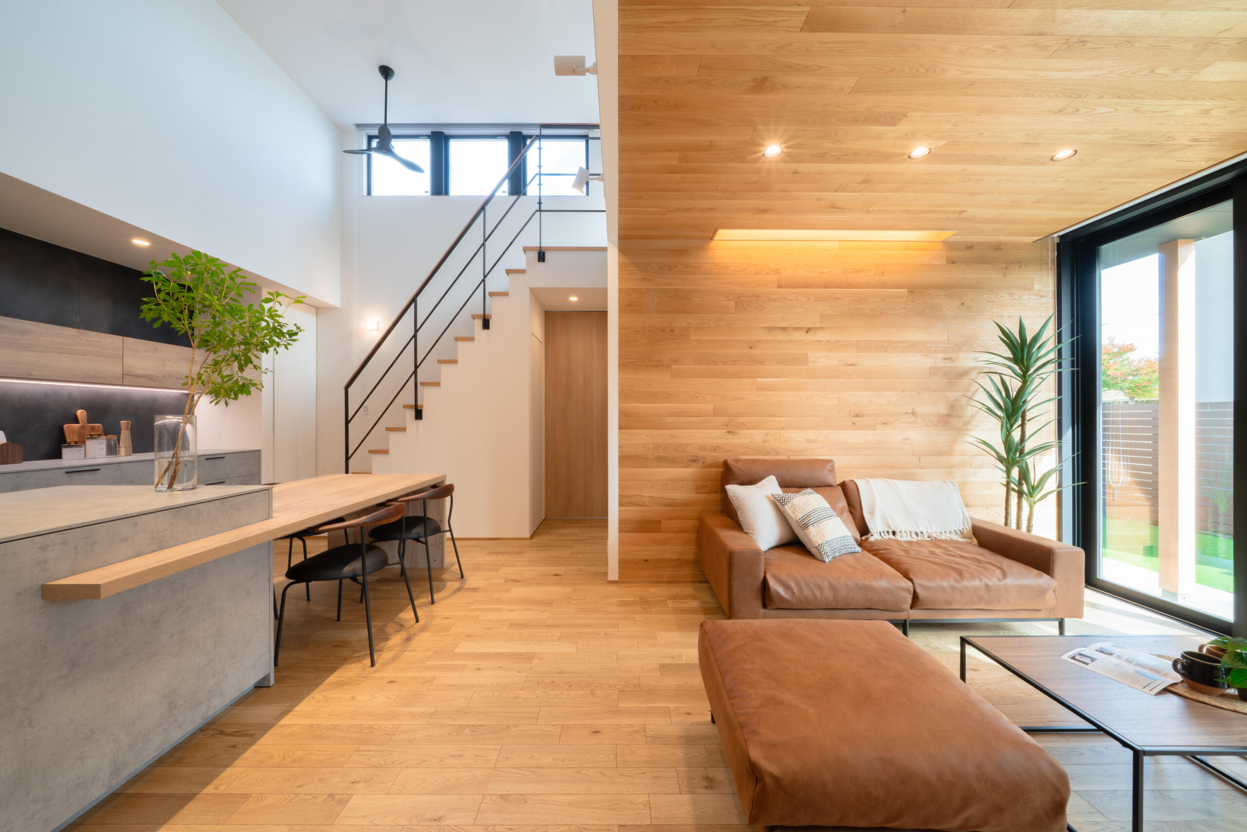 リビングは壁と天井まで木目で仕上げ、