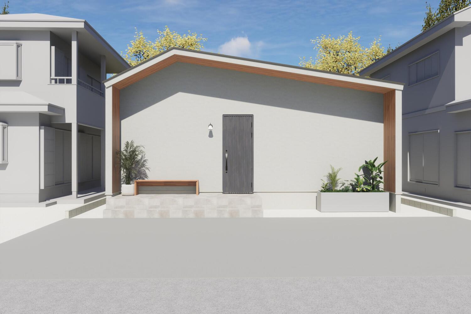- グレーのジョリパットと軒天の木目が調和し、 柔らかな雰囲気を醸し出しています