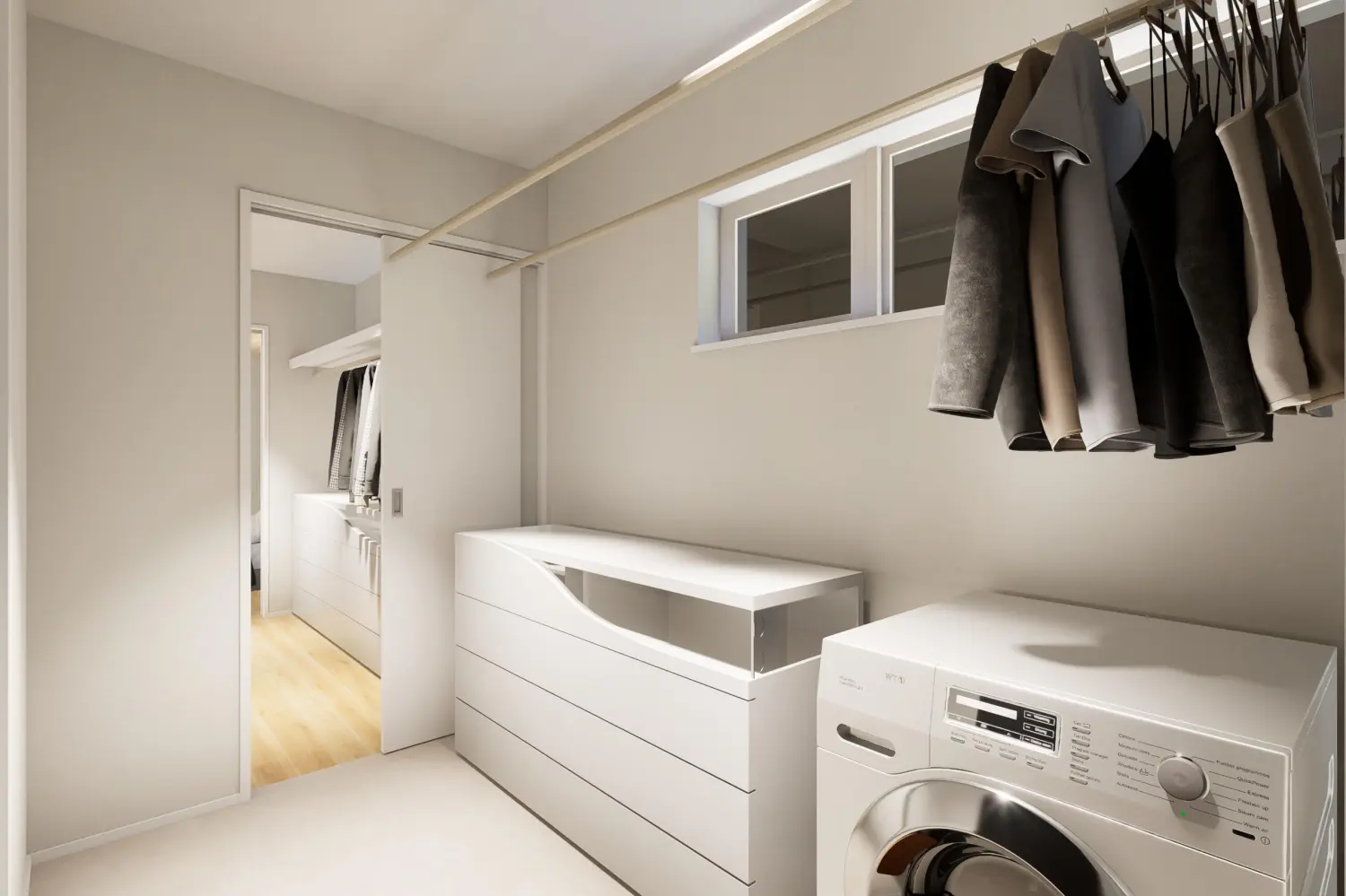 - 主寝室⇔ファミリークローク⇔サンルーム脱衣室が一直線で家事の効率化が図れます