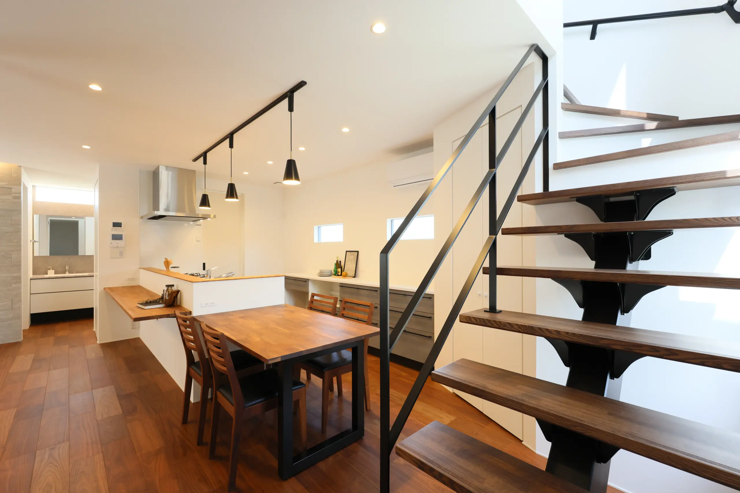 視線が抜ける軽やかなデザインの階段を採用することで、リビング全体に心地よい開放感をもたらします。