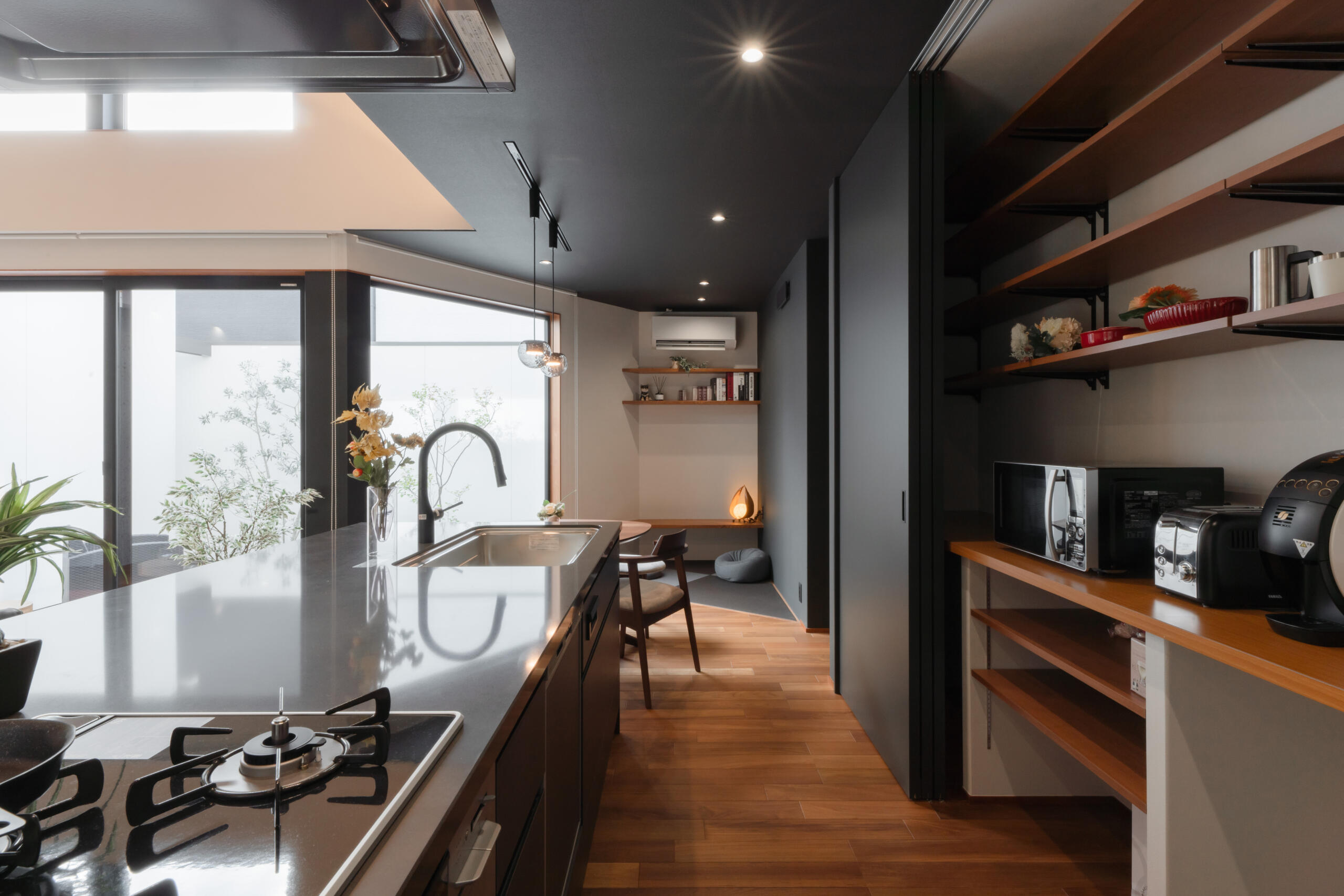 黒を基調とした重厚感あふれるアイランドキッチン。
