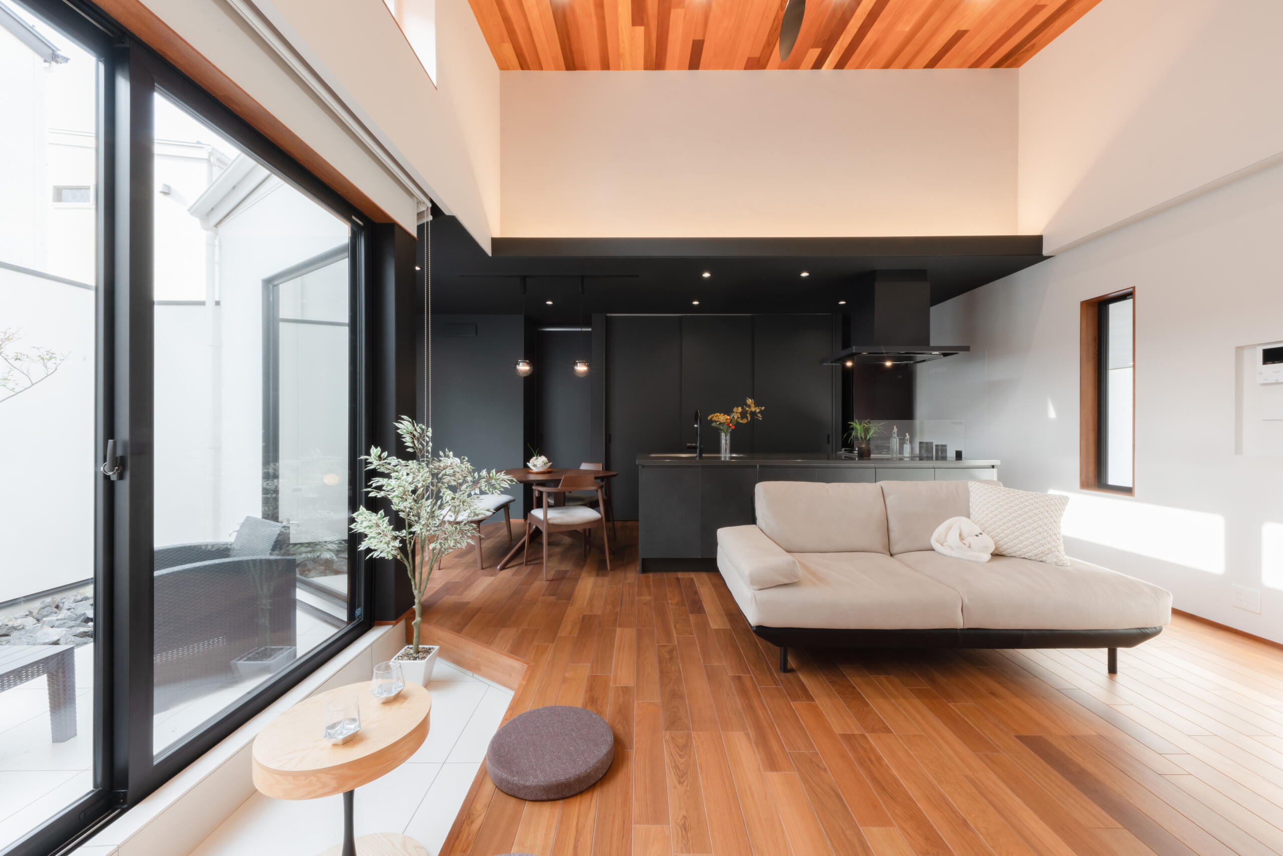 勾配天井の18.9帖LDKへと誘うのは、透明のリビングドア。