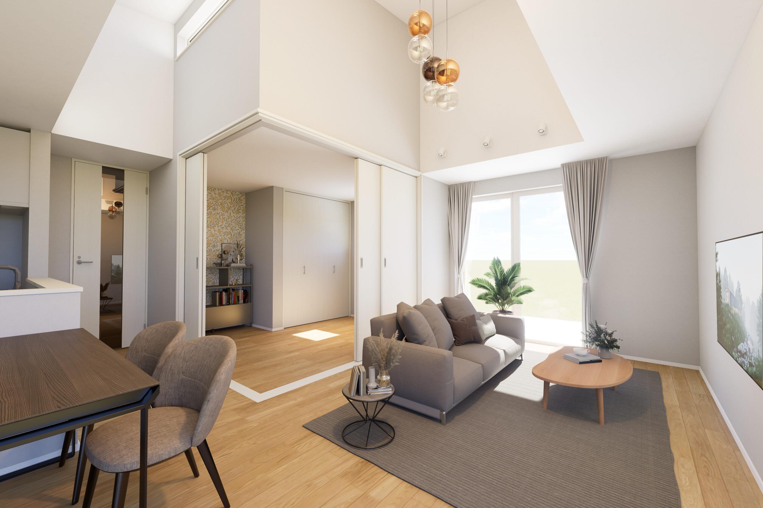 高天井と高窓が生み出す、明るく開放的な平屋。