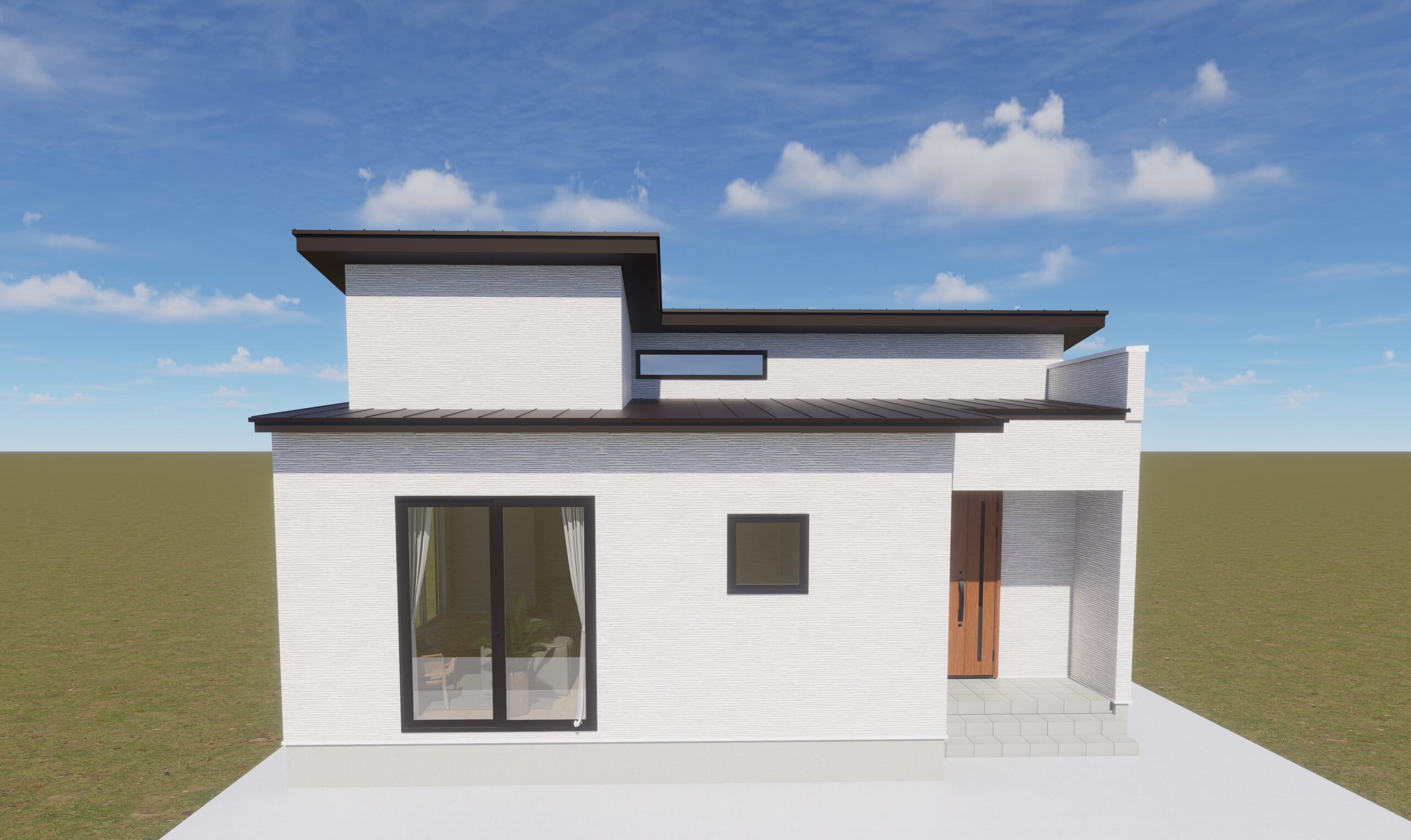 白を基調とした外壁に、深い軒と水平ラインを強調した屋根。