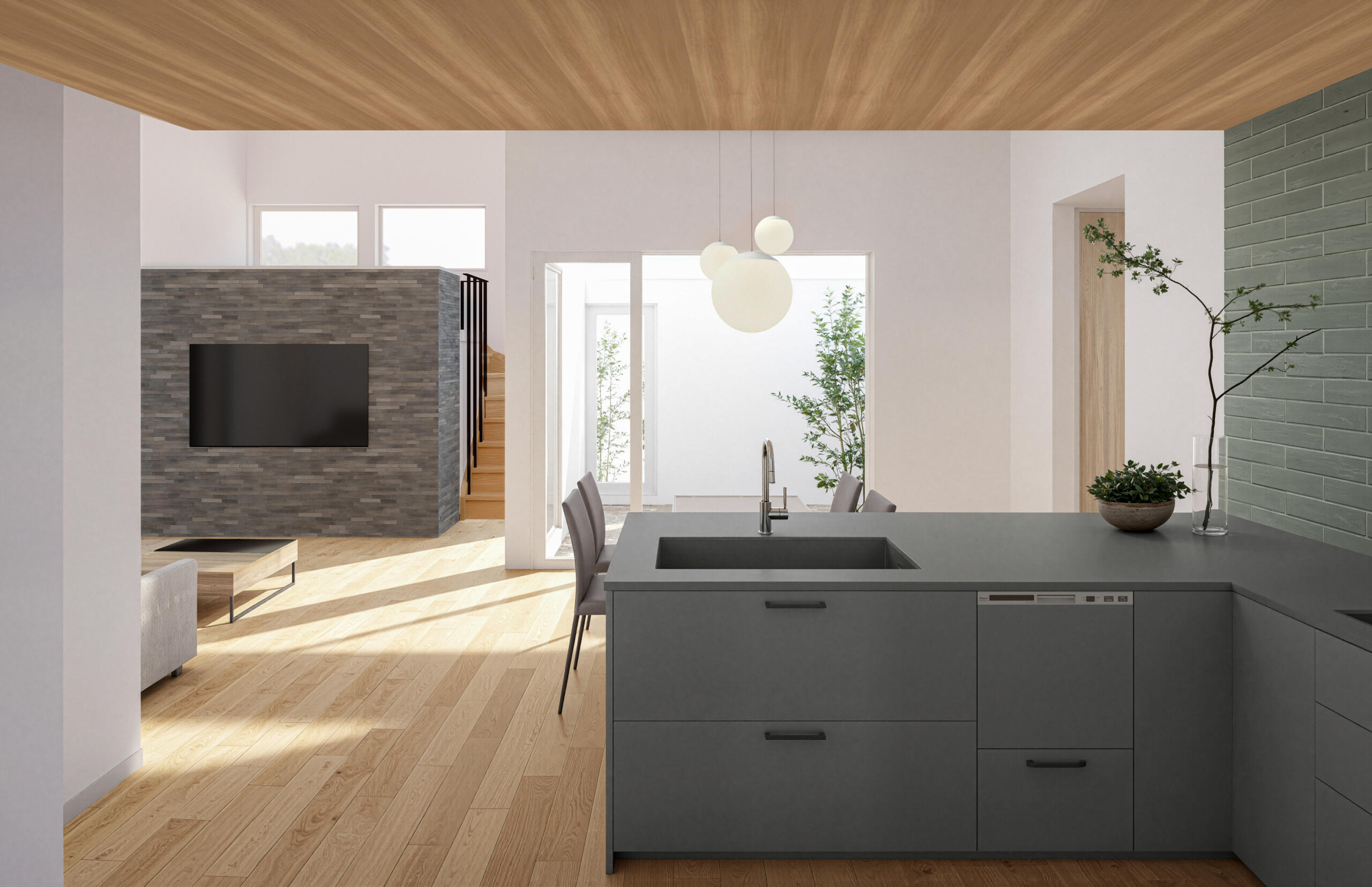 キッチンに立った瞬間、視線の先まで心地よく広がる、奥行きのあるLDK空間。