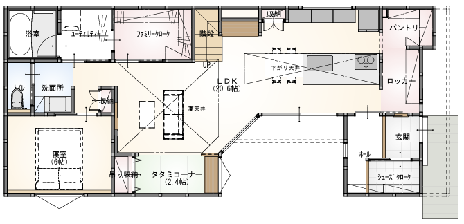 家族ロッカーをはじめ、大容量のパントリーやファミリークローク、シューズクロークを計画。