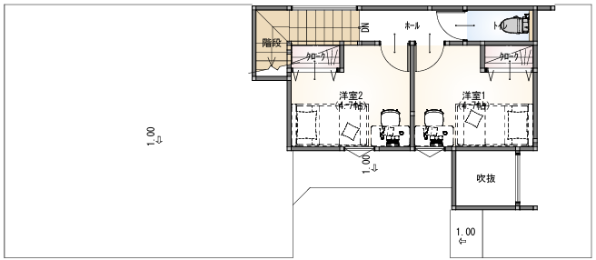 将来の介護を見据え、1階寝室とトイレを含む水まわりを寝室周辺に集約。