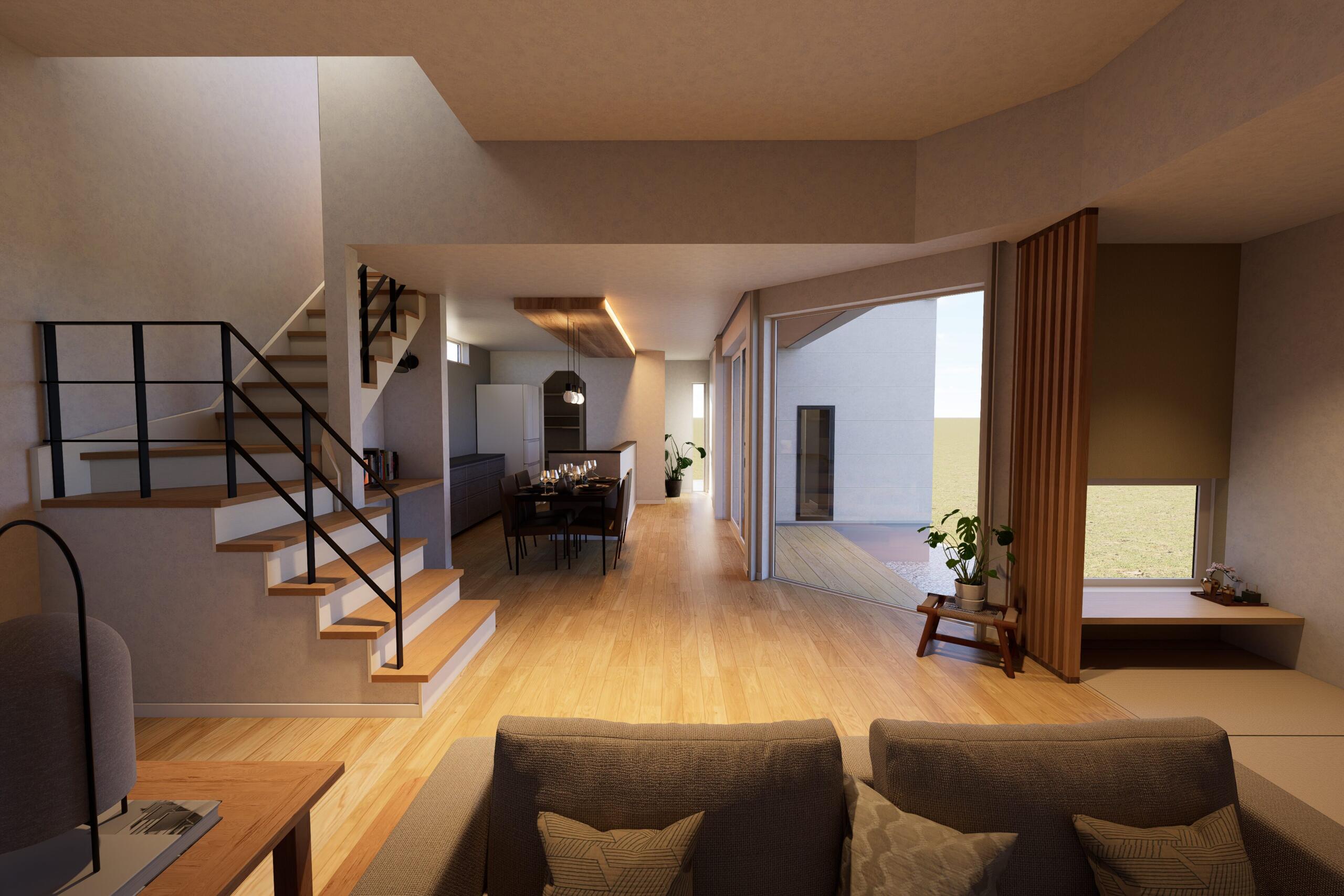 道路側からの視線に配慮しながらも、中庭に面した大開口が内と外をやさしくつなぎ、プライバシーと開放感を両立した住まいです。