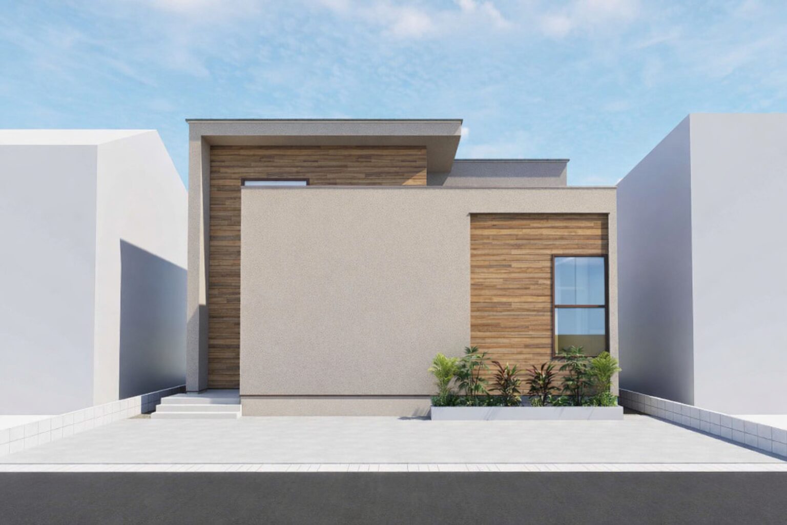 - ショッピングも通学もスムーズにできる立地。 ベージュの外壁にアクセントの木目を取り入れた、シンプルだけどおしゃれな外観です。