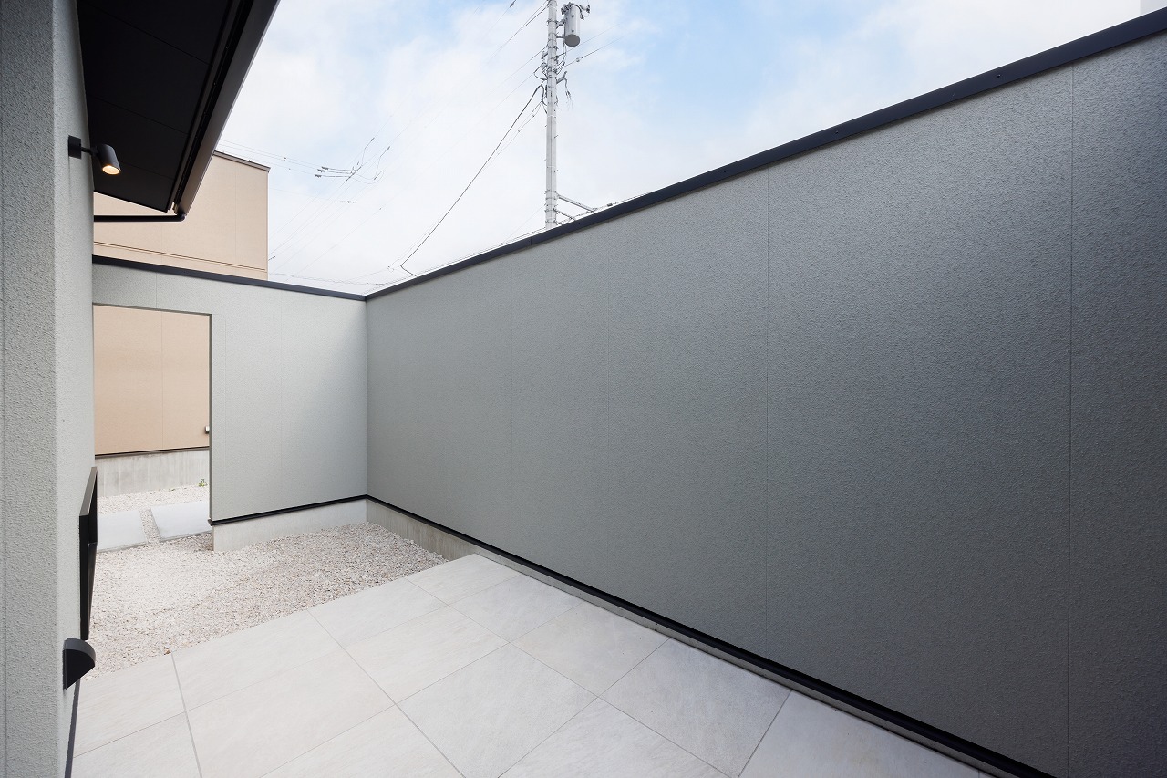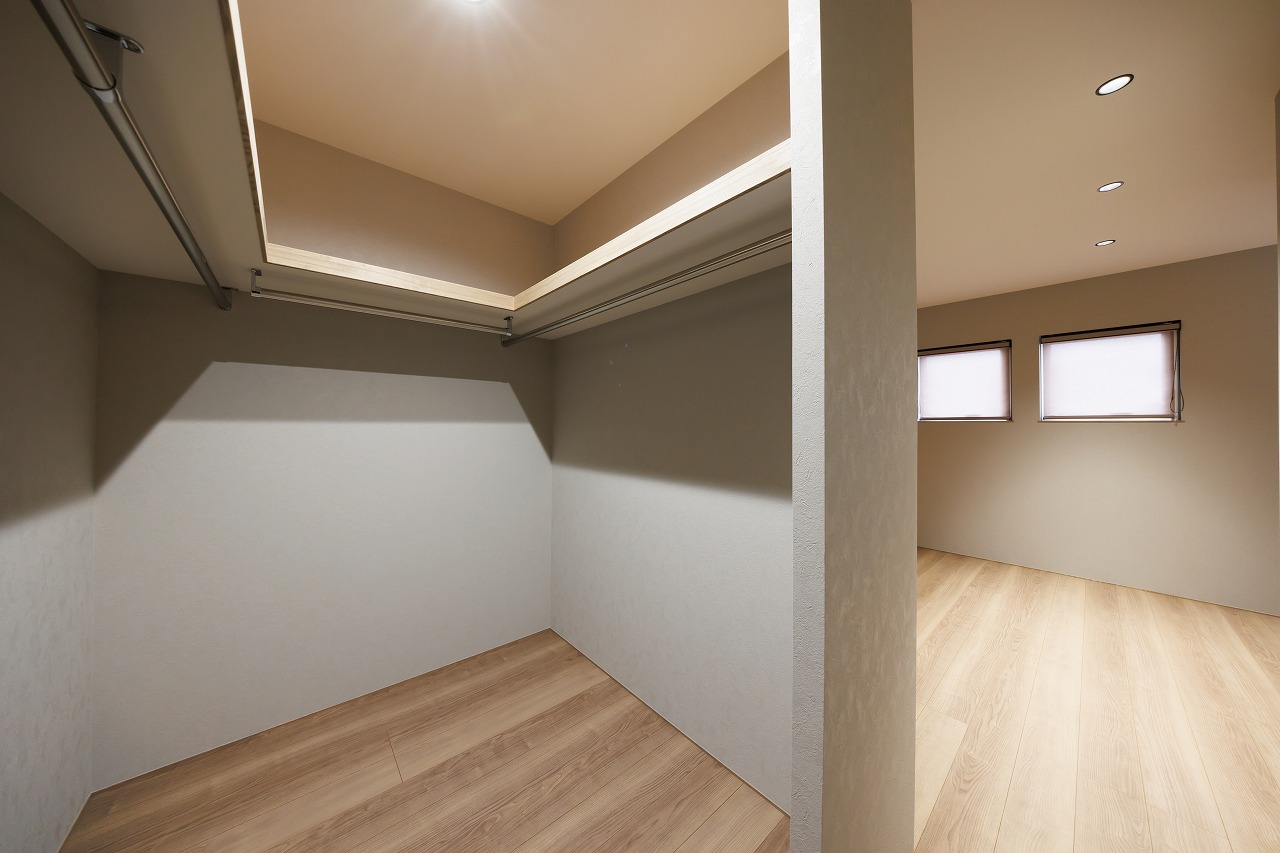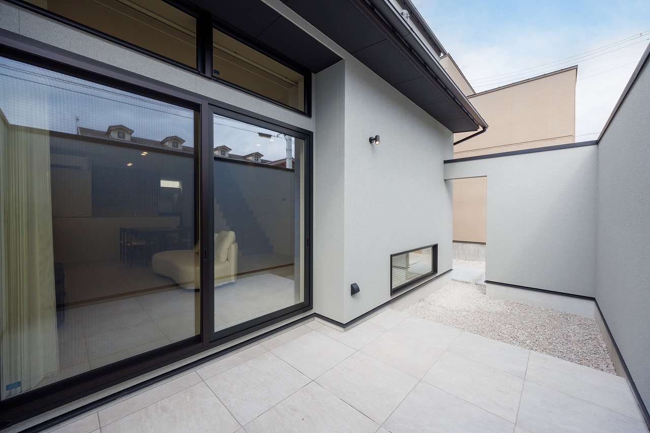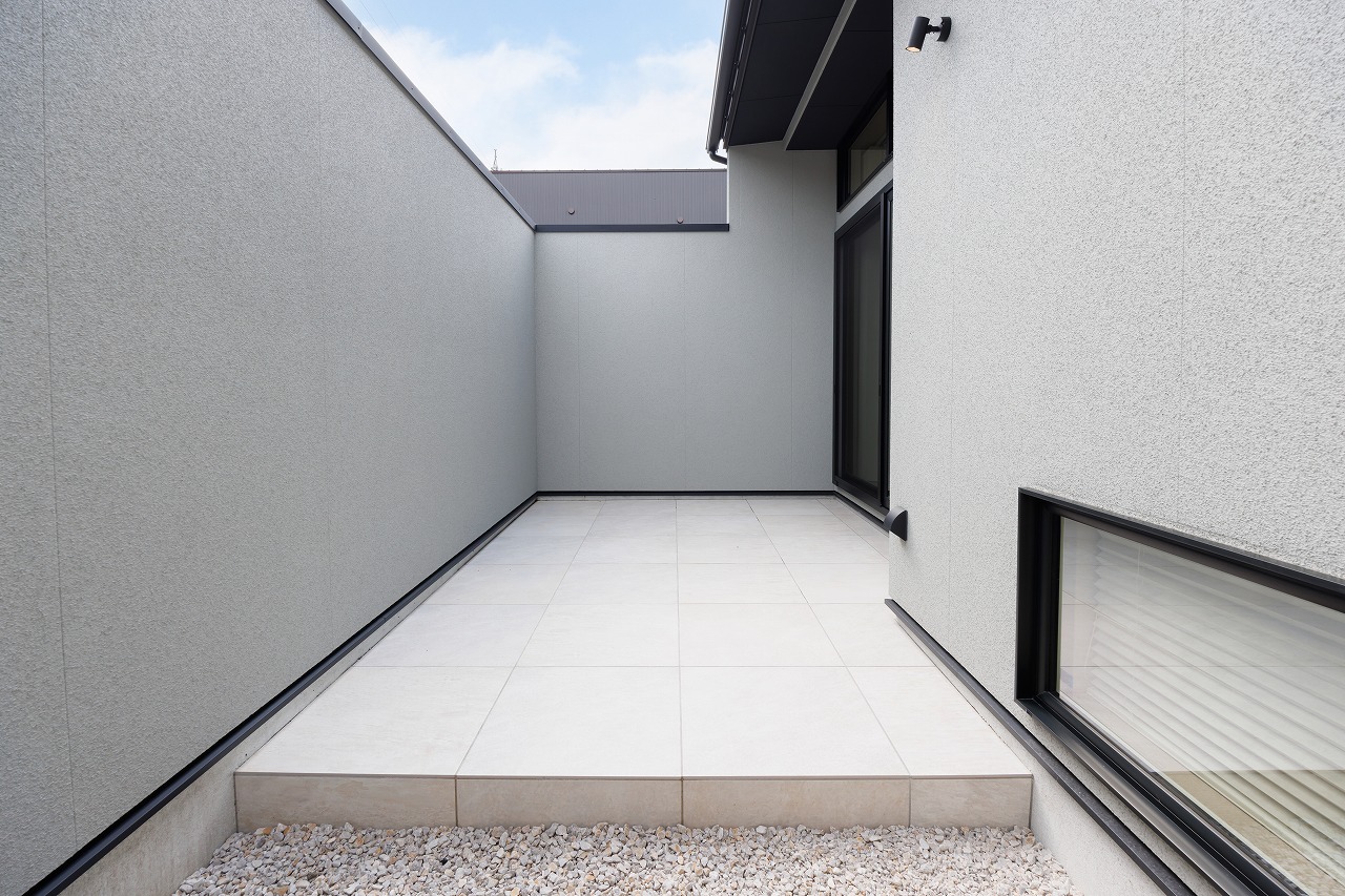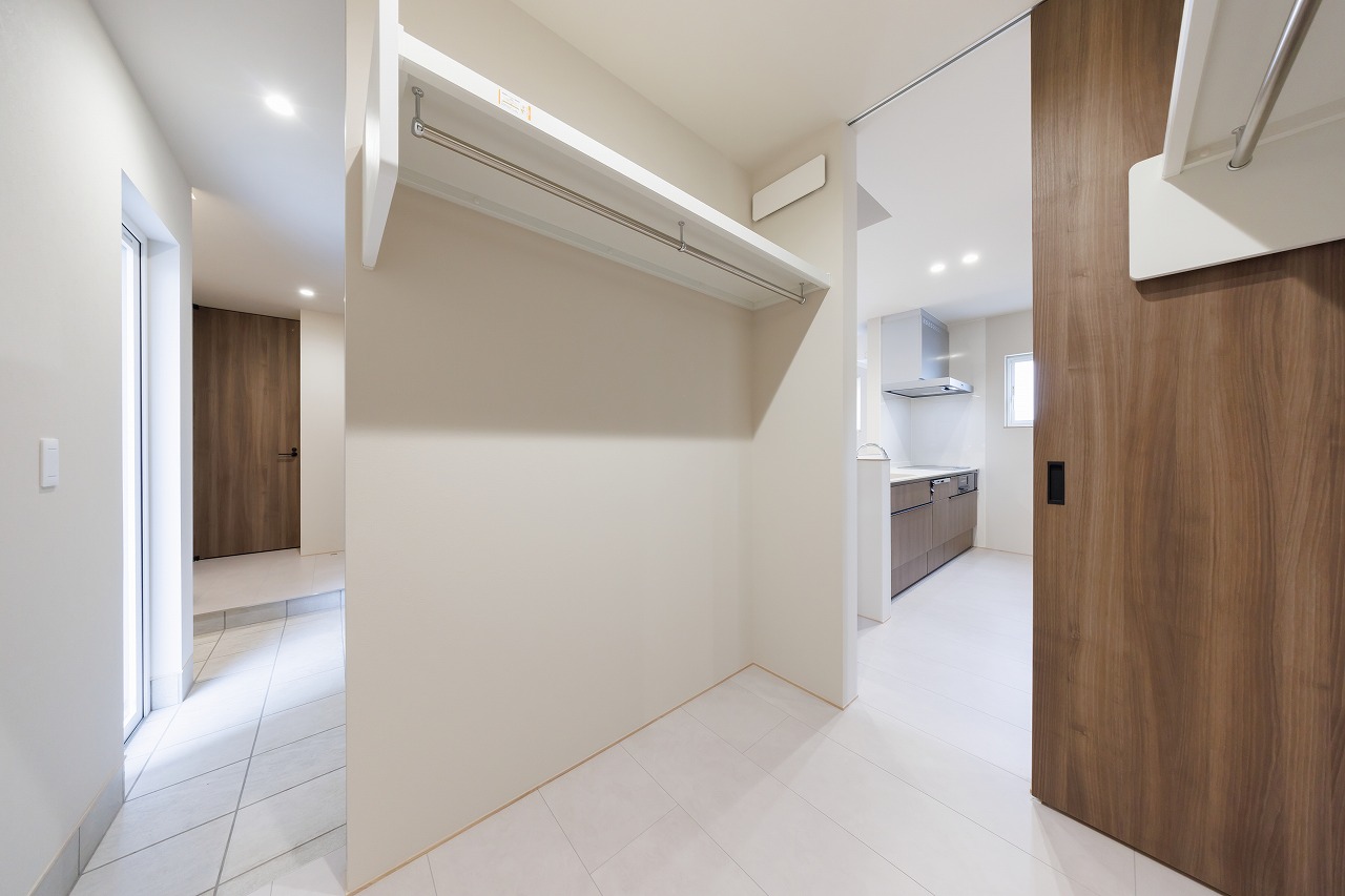 POINT | 塀で囲まれた中庭は外からの視線を遮りながらもリビング空間に光を取りこみます。サンルームからファミリークロークへの動線もコンパクトで、ハンガーで干したまま収納が可能◎ |
