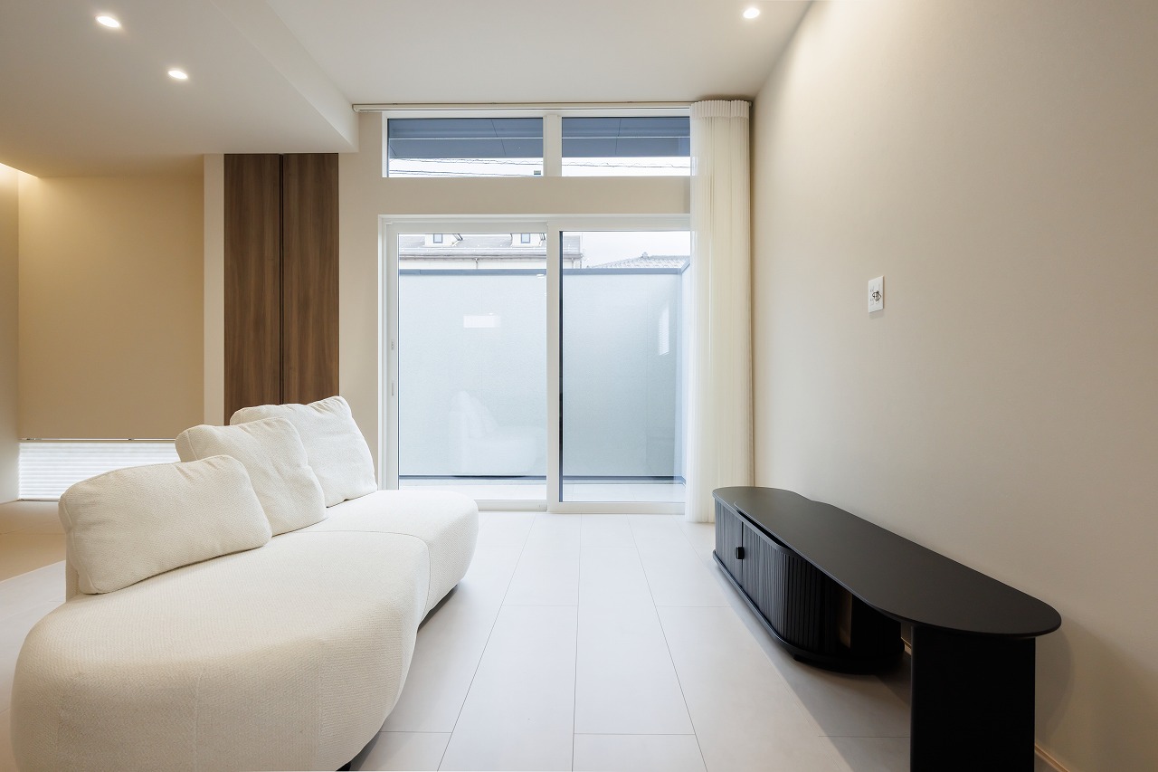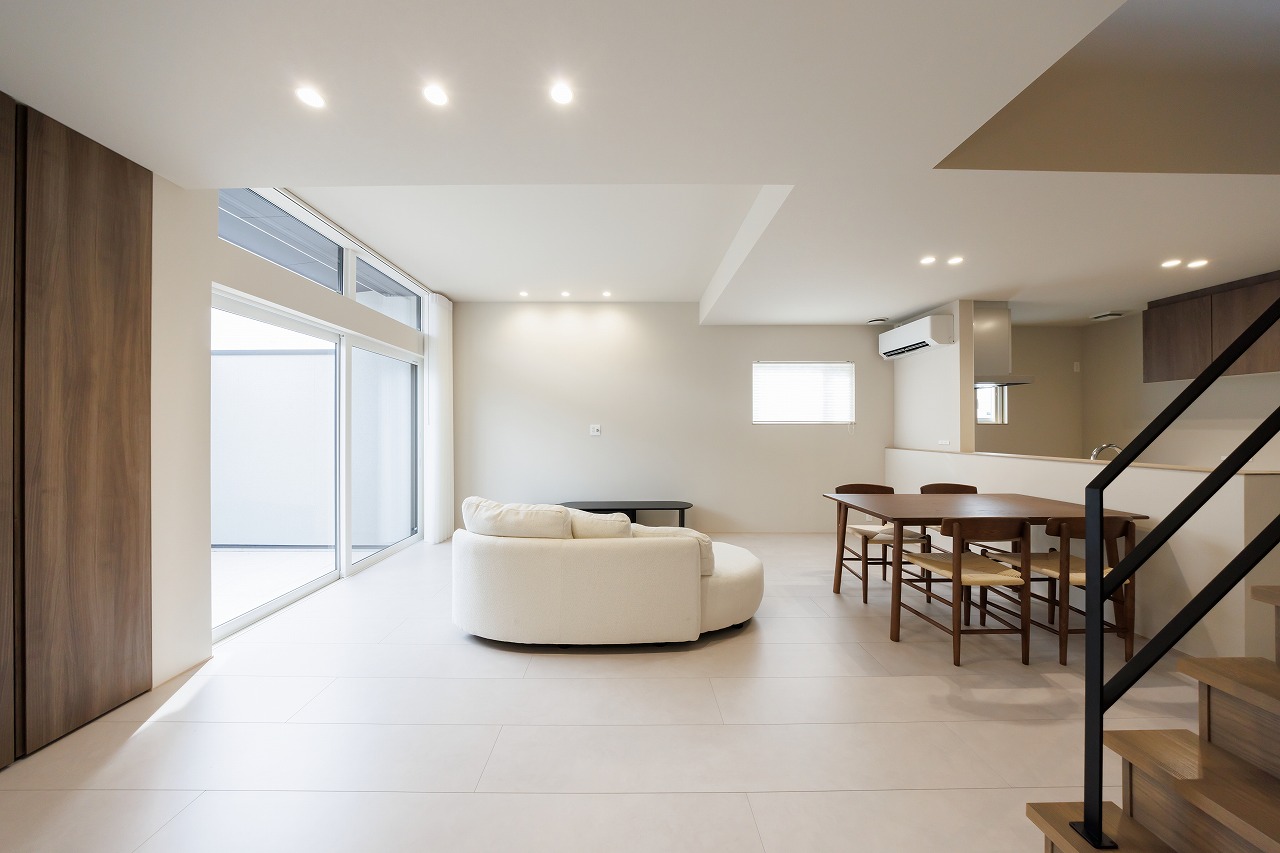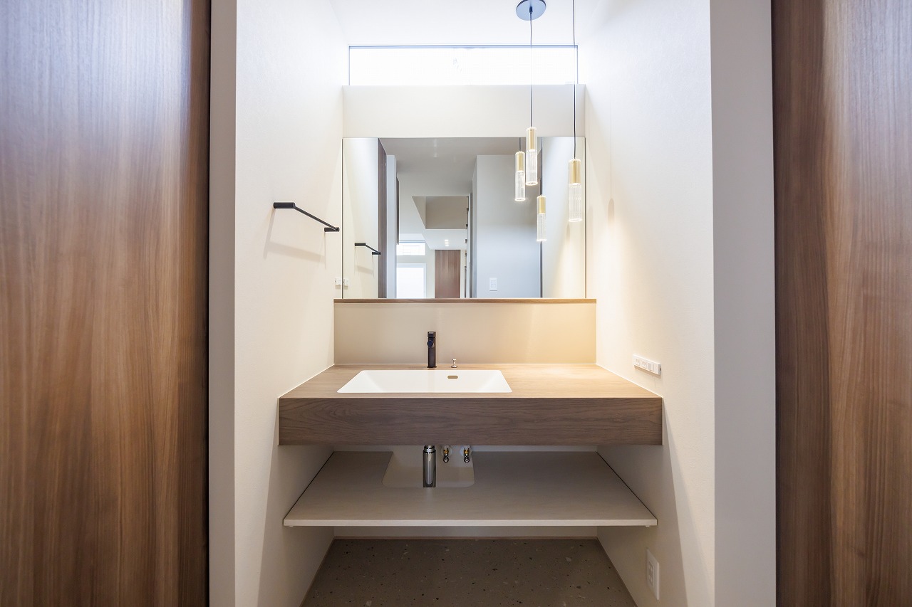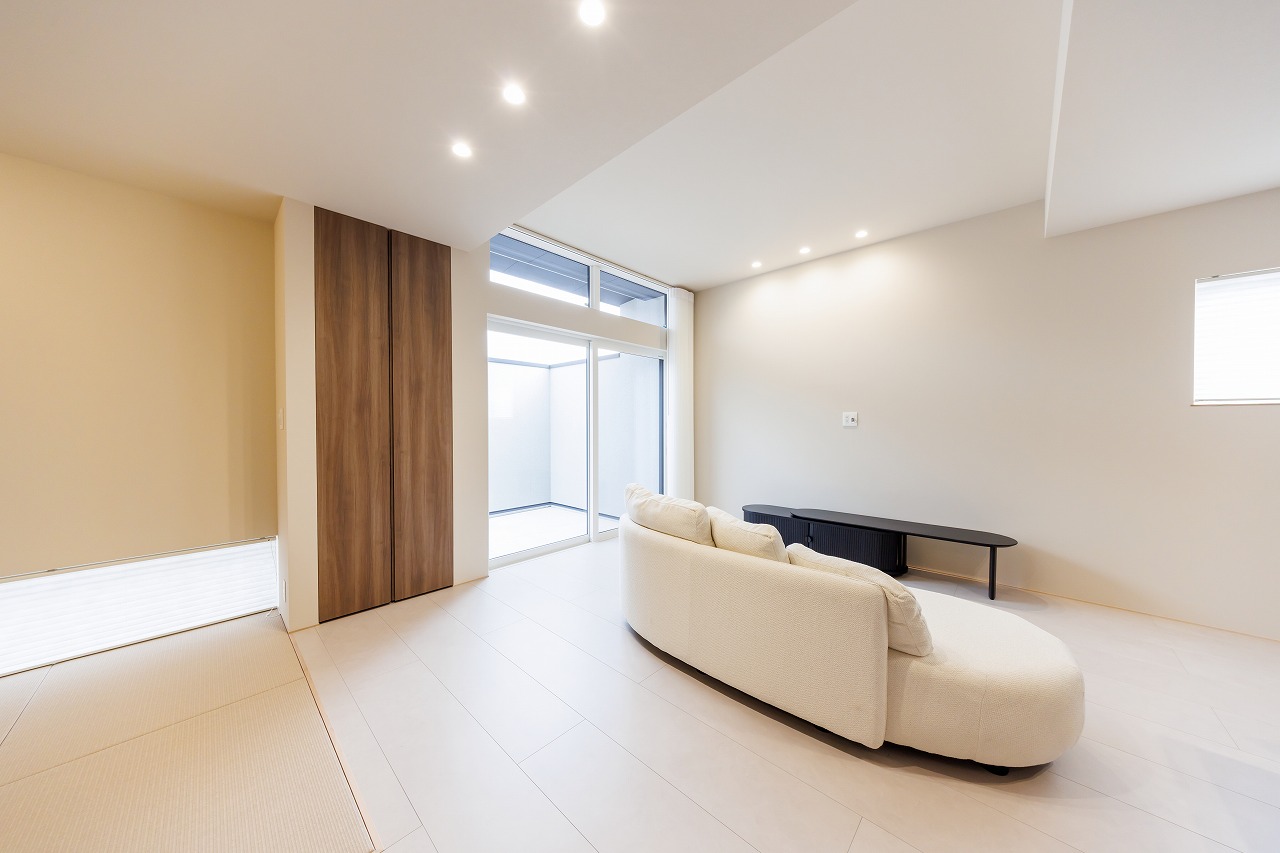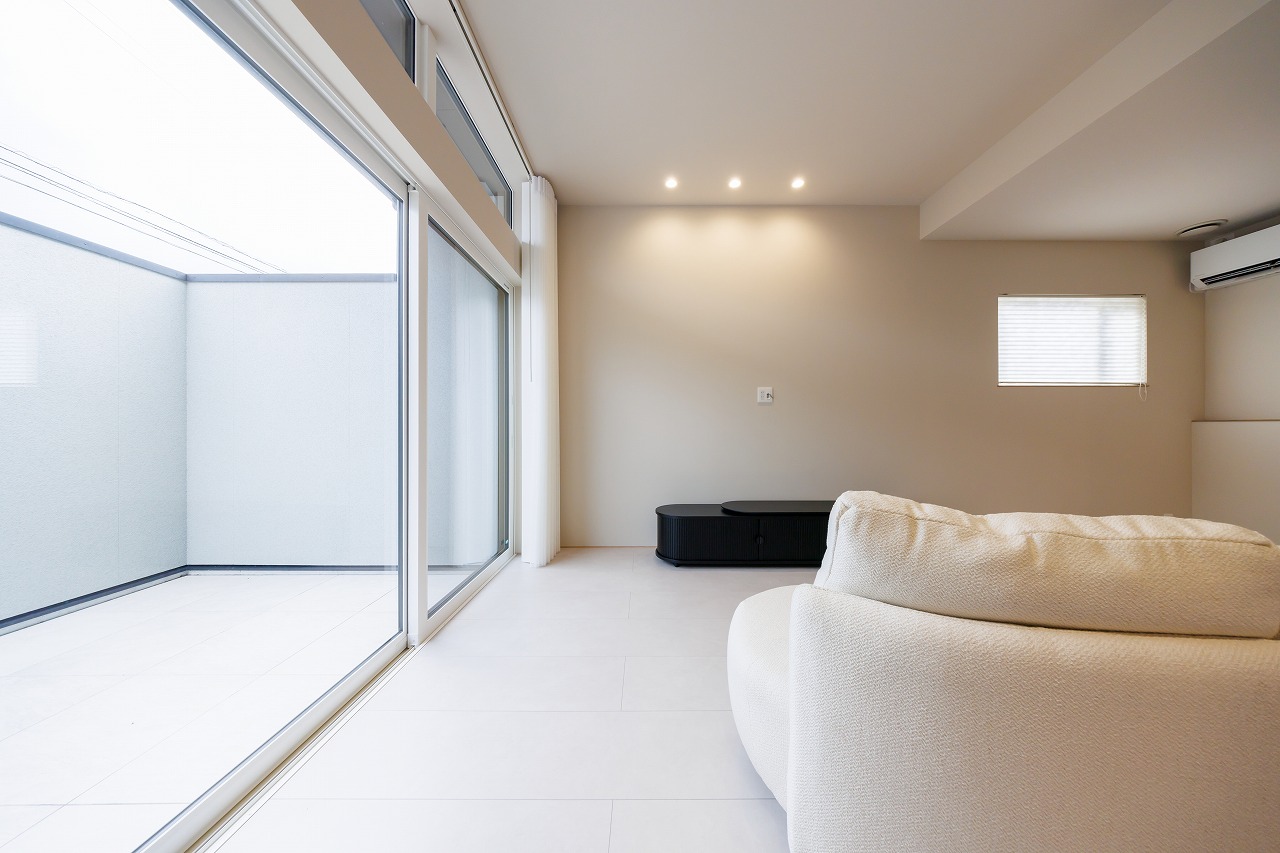POINT | 塀で囲まれた中庭は外からの視線を遮りながらもリビング空間に光を取りこみます。サンルームからファミリークロークへの動線もコンパクトで、ハンガーで干したまま収納が可能◎ |