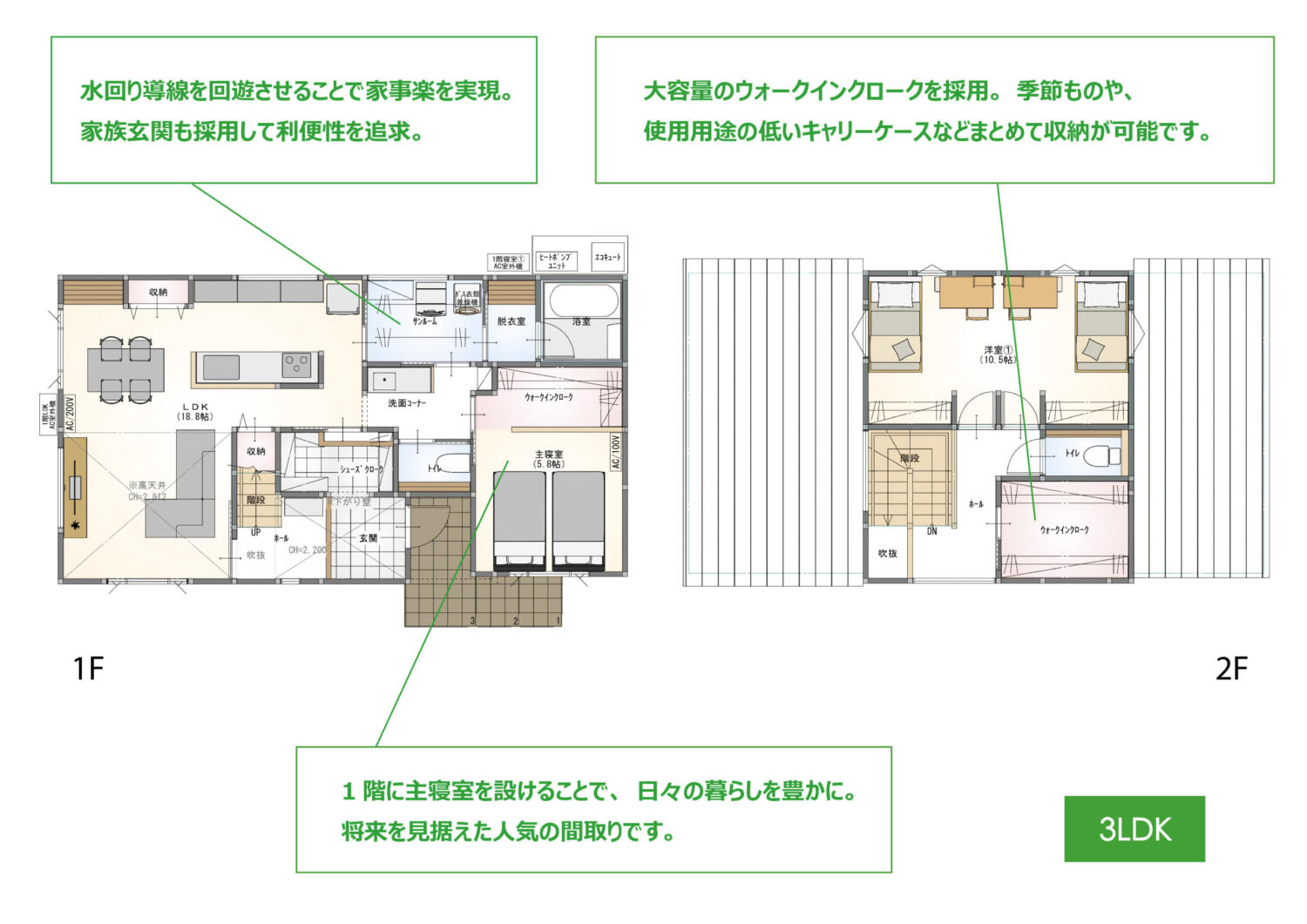 | POINT | 1階にLDK、水回り、主寝室、WICを配置したので、主要な家事はワンフロアで 完結。 歳を重ねても安心の住まいです。 |