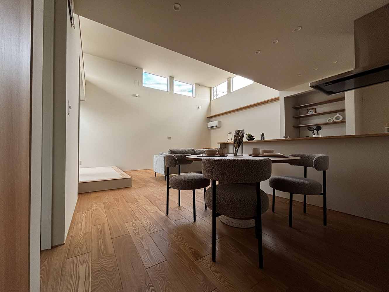 - 吹き抜けのリビング。 高窓から光が注ぐLDK。