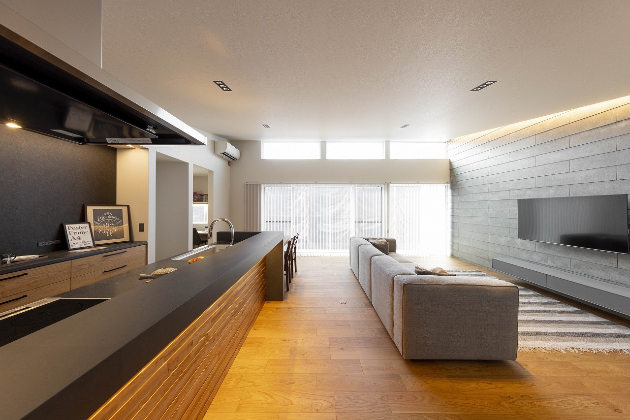直線的で無駄のないデザインが都会的なスタイルを際立たせ、インテリアの魅力を引き立てます。時間帯や季節によって移ろう光が、日常に新たな発見と心地よさを添える、洗練されたリビングです。