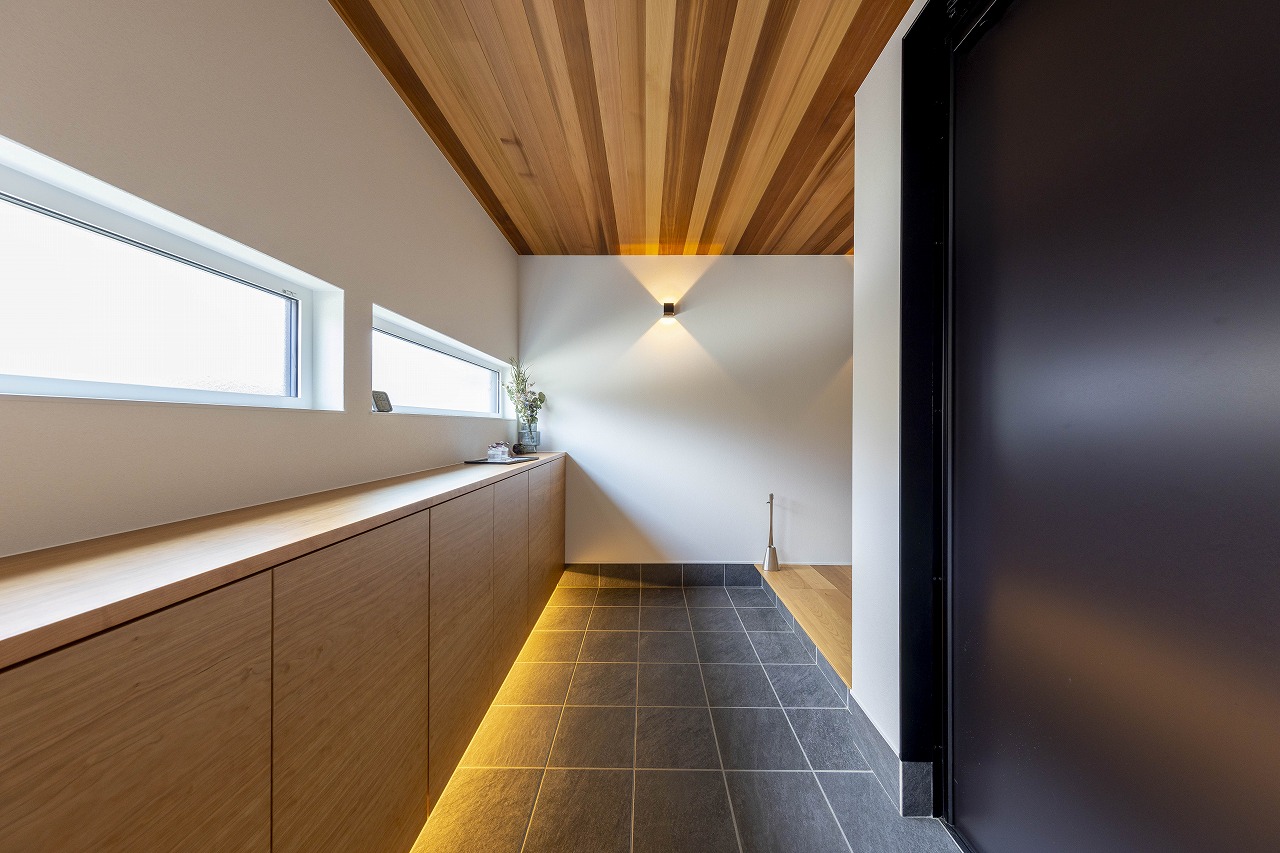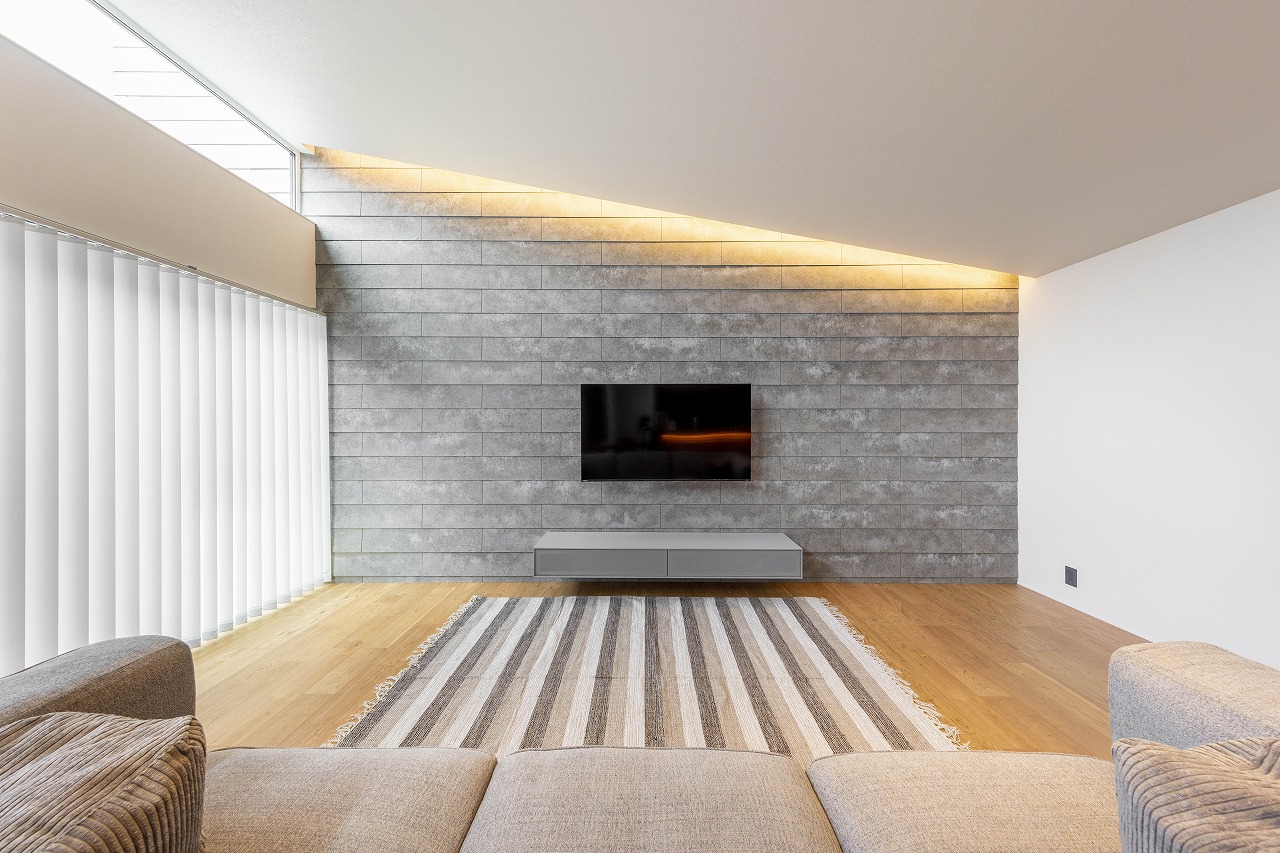 大きな窓から差し込む自然光と、勾配天井に仕込んだ間接照明の光。計算された照明の陰影が織りなすコントラストが、空間に奥行きと表情をもたらします。