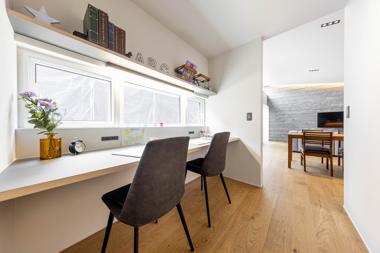 家族のいるLDKとつながるスタディスペースは、集中できる環境とコミュニケーションのバランスを両立。二人並んで使えるカウンターは右手側がLDKに面しており、リビングの様子を感じながら学習や作業ができます。独立した空間でありながら、家族の気配が心地よく伝わる、毎日の学びを支える設計です。