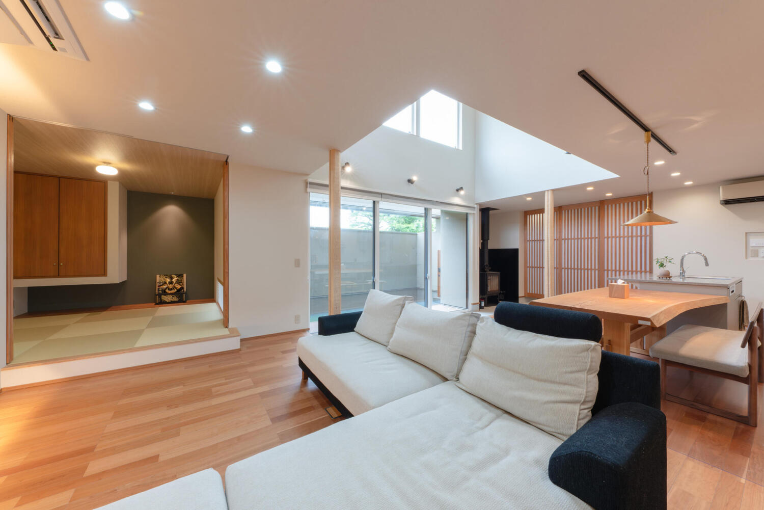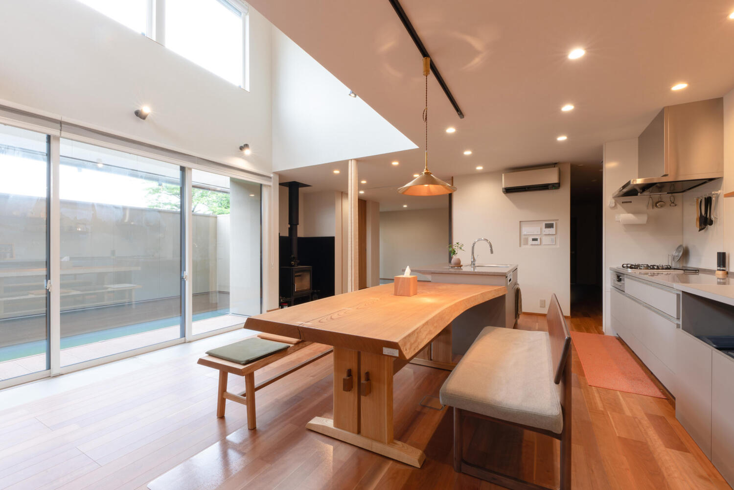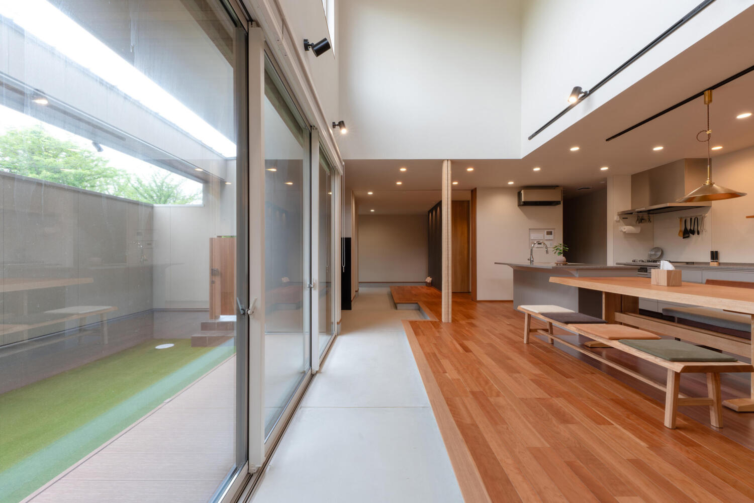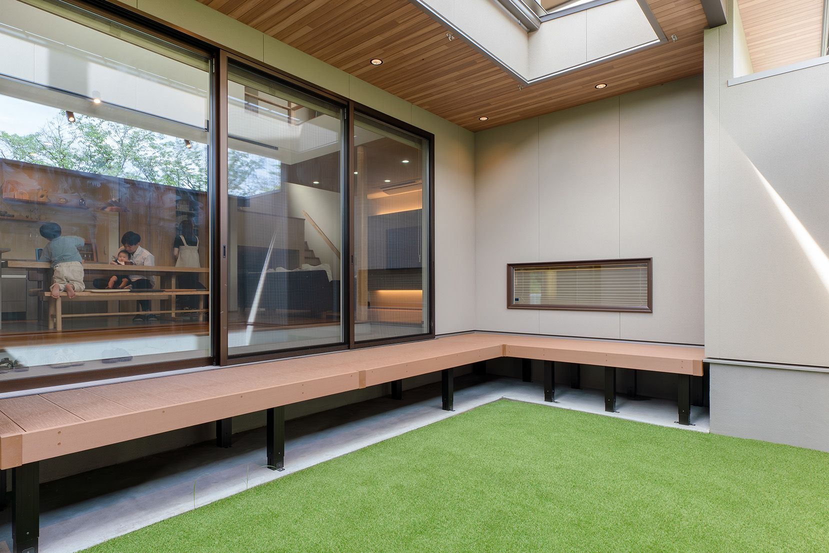 LDKから大きな開口でつながる中庭は視線を気にせずプライベートに自然を感じられる特別な場所。子供たちの遊び場や友人を招いてのBBQ、また休日のブランチや夜の星空を眺める時間など、使い方は自由自在です。LDKには中庭からのやわらかな自然光が降り注ぎ、外の風景と室内がやさしくつながる開放感たっぷりの空間になりました。