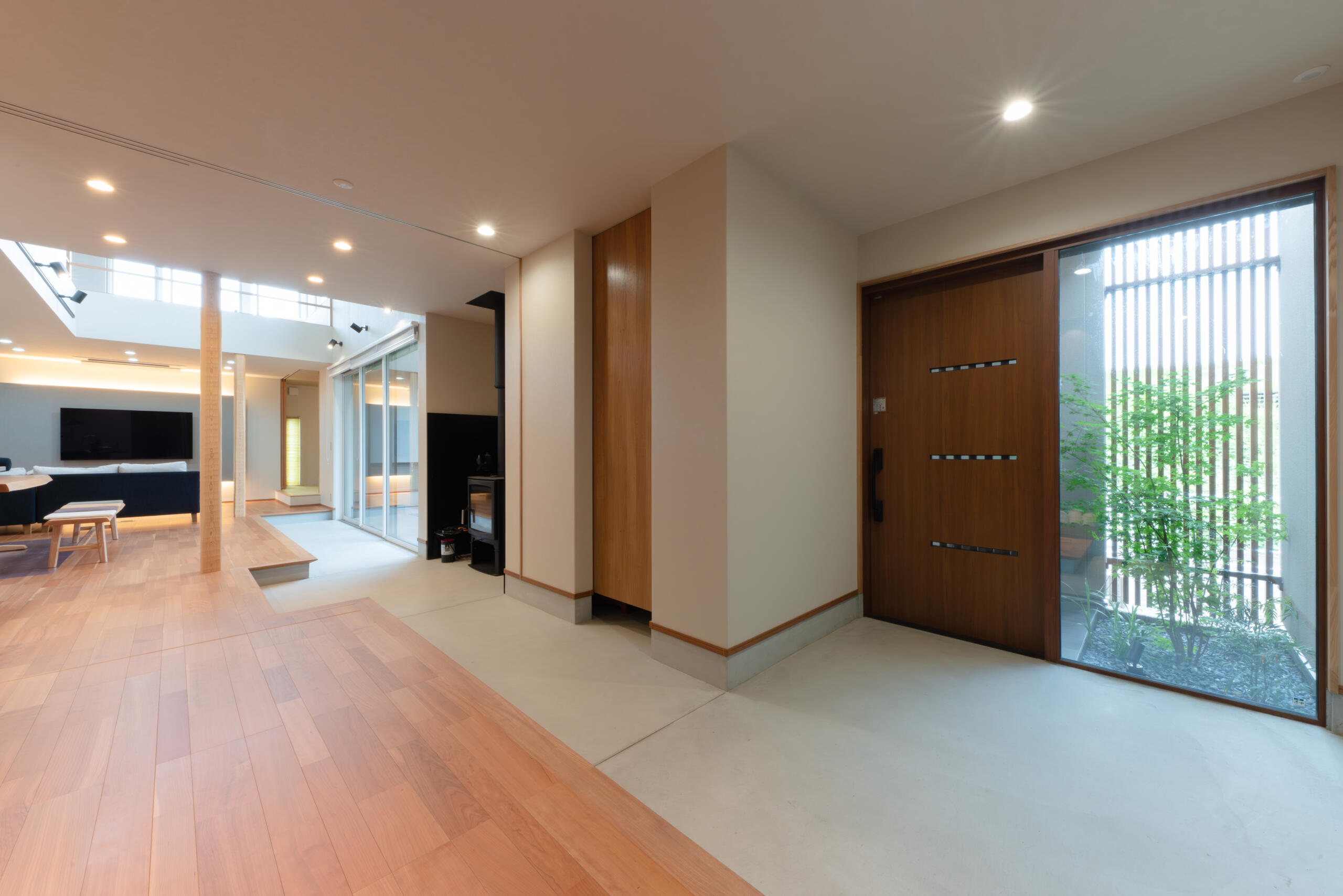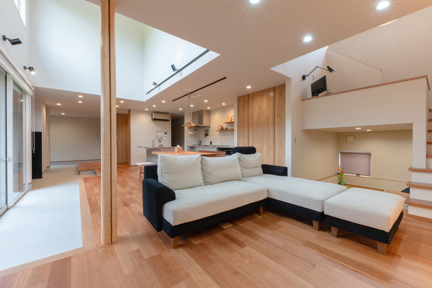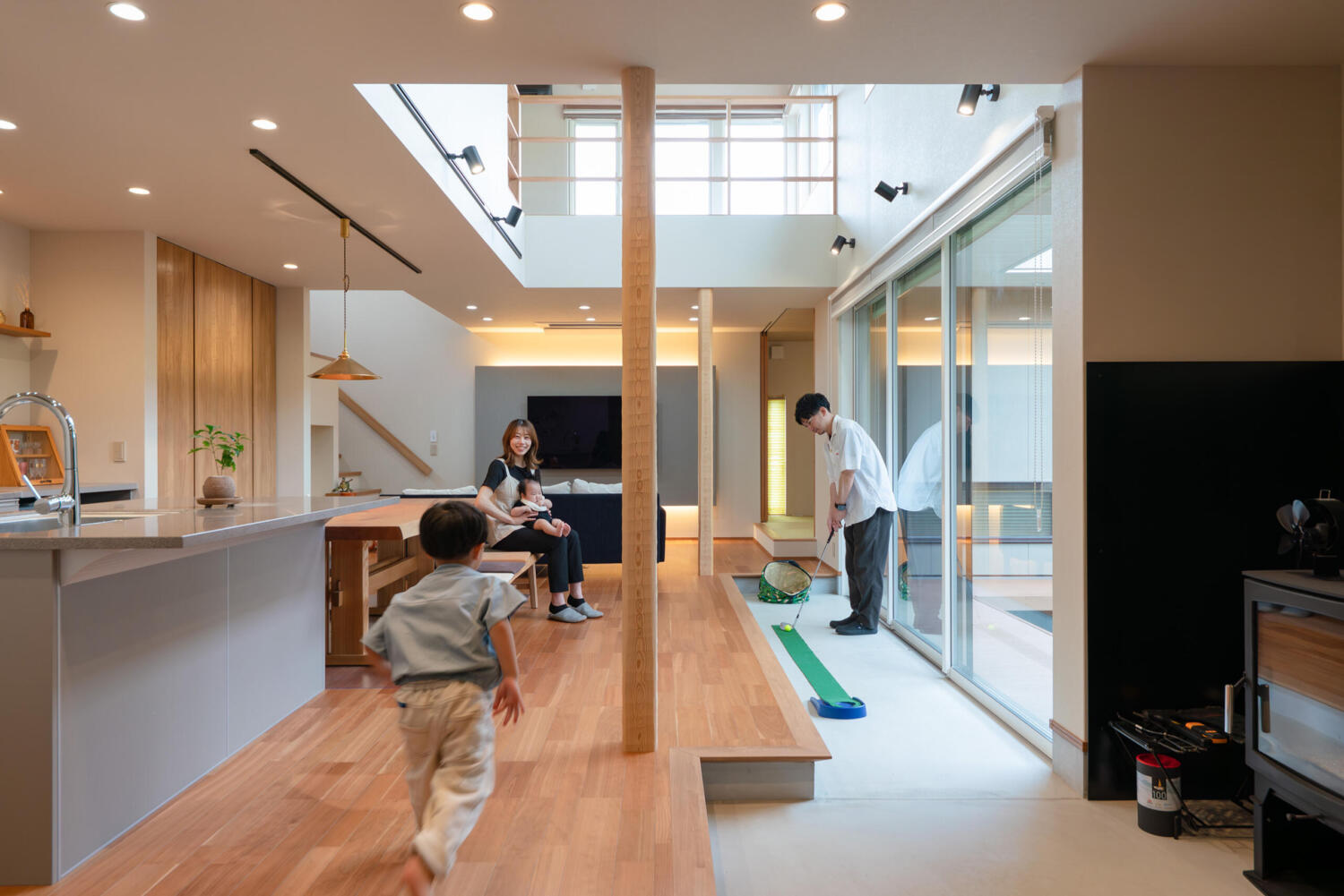 モダンなデザインと和の要素が美しく調和した、解放感のあるリビング空間が魅力。玄関を入ると、広々とした土間スペースが出迎えてくれ、木の温もりを感じるフローリングとともに、自然素材のやさしさが随所に感じられます。玄関から伸びた土間スペースはゴルフのパター練習や軽い運動などもでき、屋内にいながらもアウトドア感覚の楽しみ方ができるほか、安心して子どもが走り回れる広さと視認性を兼ね備えた設計になっています。住まいを計画されるきっかけの一つに「子供が生まれて自由に走り回って遊んだり趣味を楽しんだりする空間が欲しかった」とのこと。静かに流れる時間の中で、自分たちらしいライフスタイルを丁寧に育てていける理想の住まいとなりました。