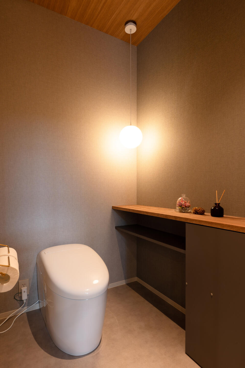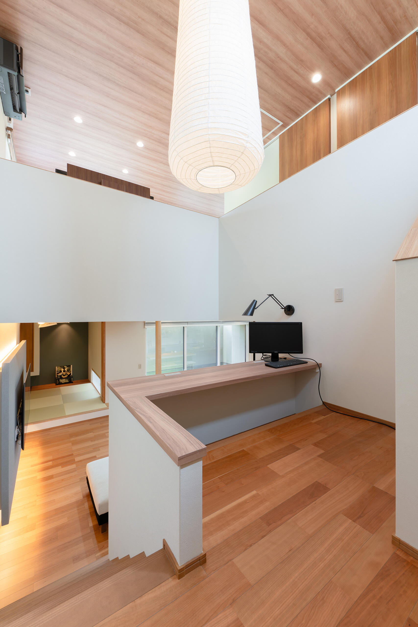 階段の踊り場には、ワークスペースを設けました。吹き抜けのリビングや和室とゆるやかにつながりながらも、しっかりと集中できるセミプライベートな場所としても活躍。気の質感を生かした床と天井、そして柔らかな光を拡げる和紙風の照明が、仕事や読書の合間にも自然と心を落ち着けてくれます。