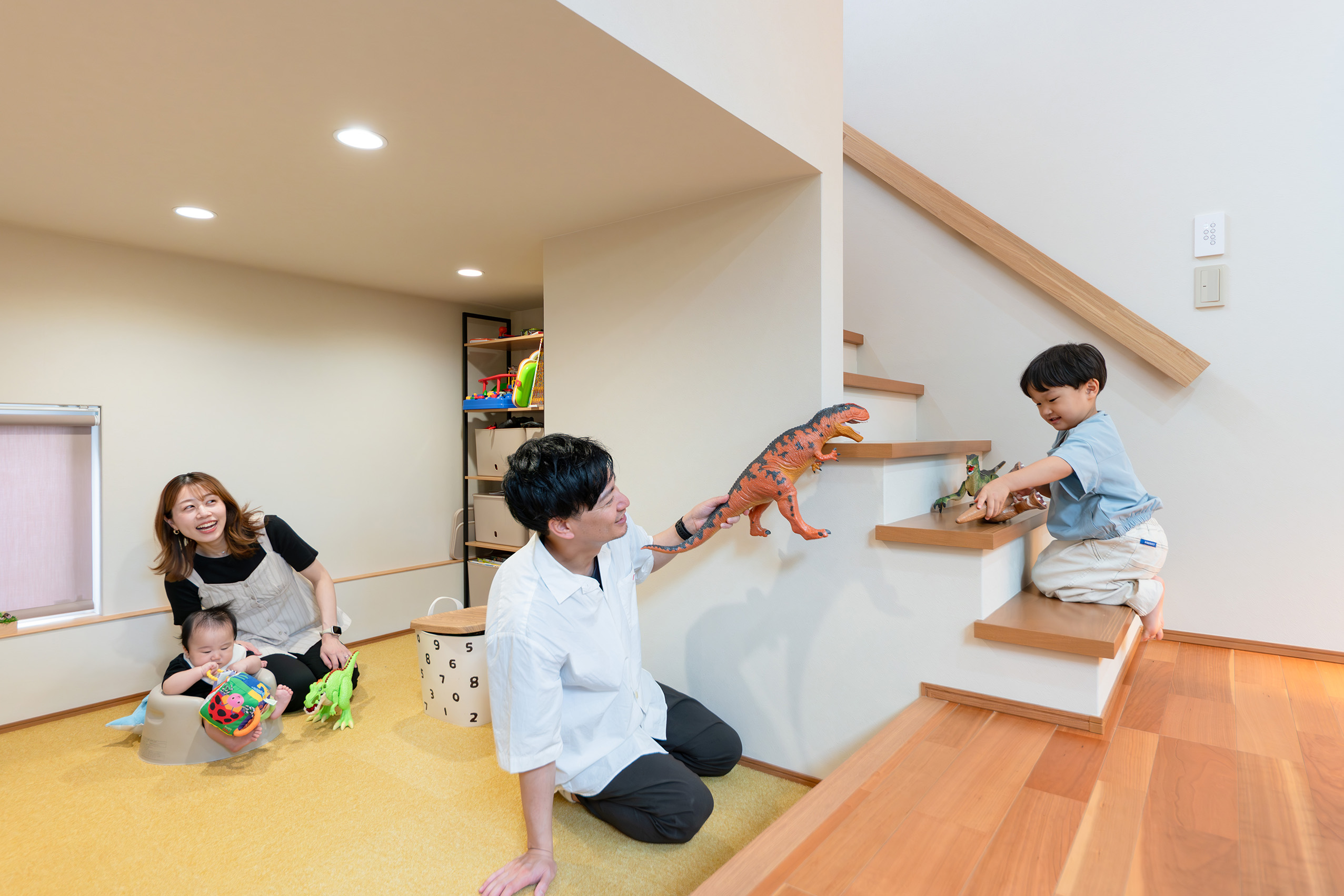 印象的なのは階段下のデッドスペースを有効活用したキッズスペース。天井は低めながらも、安心して遊べる明るくやわらかな空間で、小さなお子様にとってはまるで秘密基地のような楽しい居場所になっています。床はカーペット素材で転んでも安心。おもちゃや絵本の収納棚を設け、子ども自身が片付けを覚えながら自主性を育むこともできます。また、家族が見守れる場所に配置されているため、キッチンやリビングにいながらでも目が届く安心設計です。