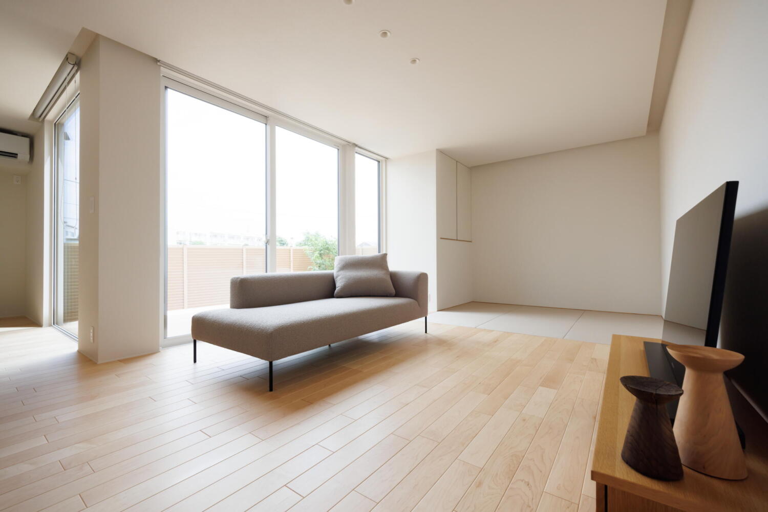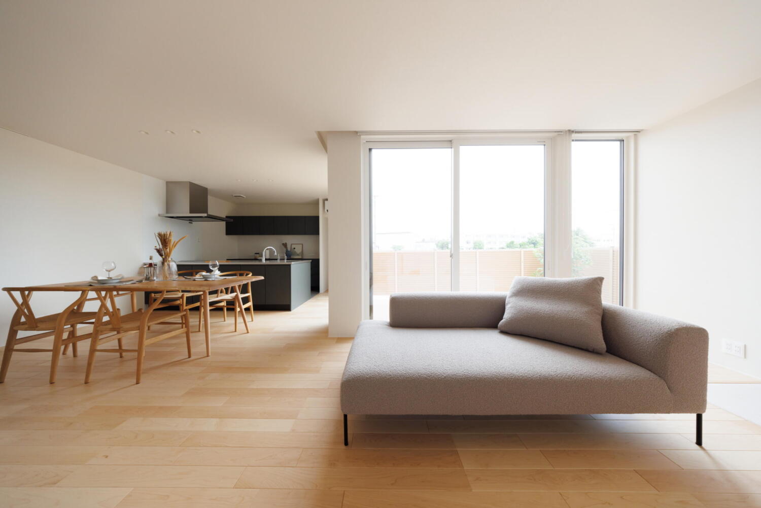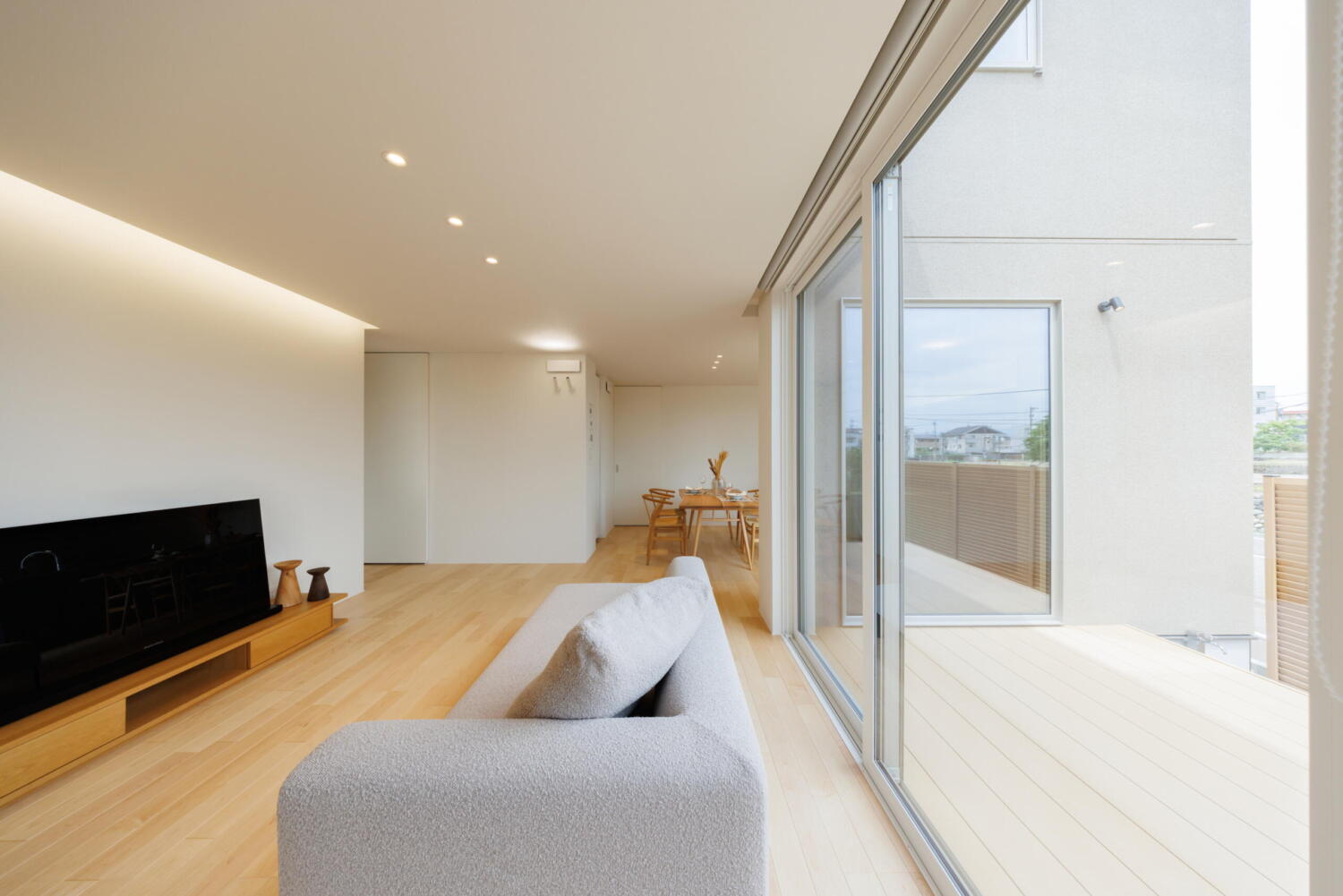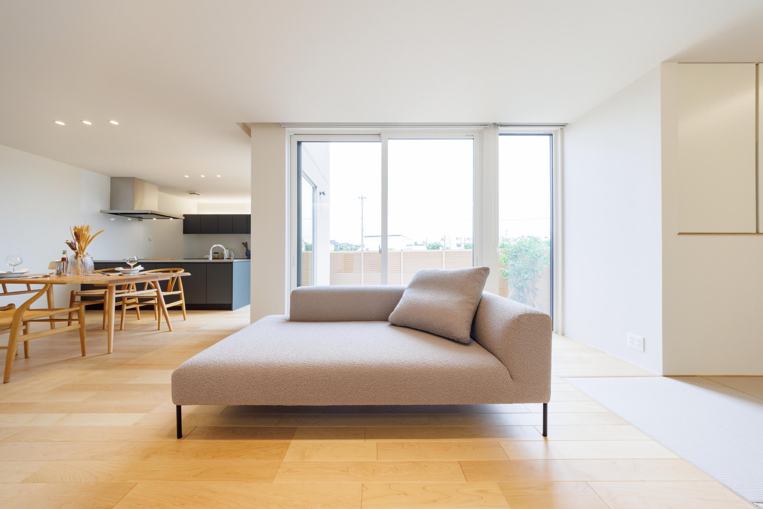 明るい木目の床と白を基調とした空間に、やわらかな光が差し込むリビング。