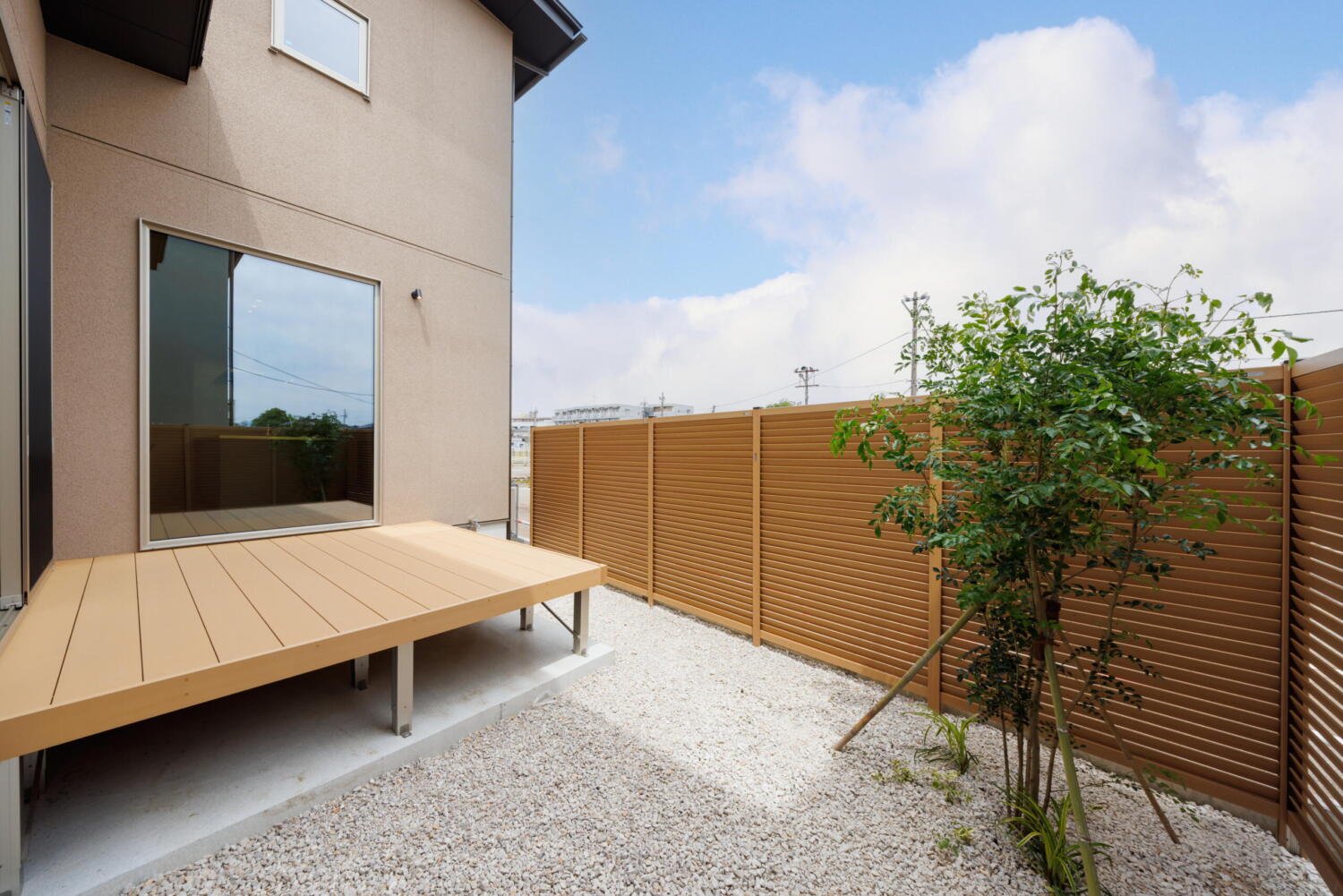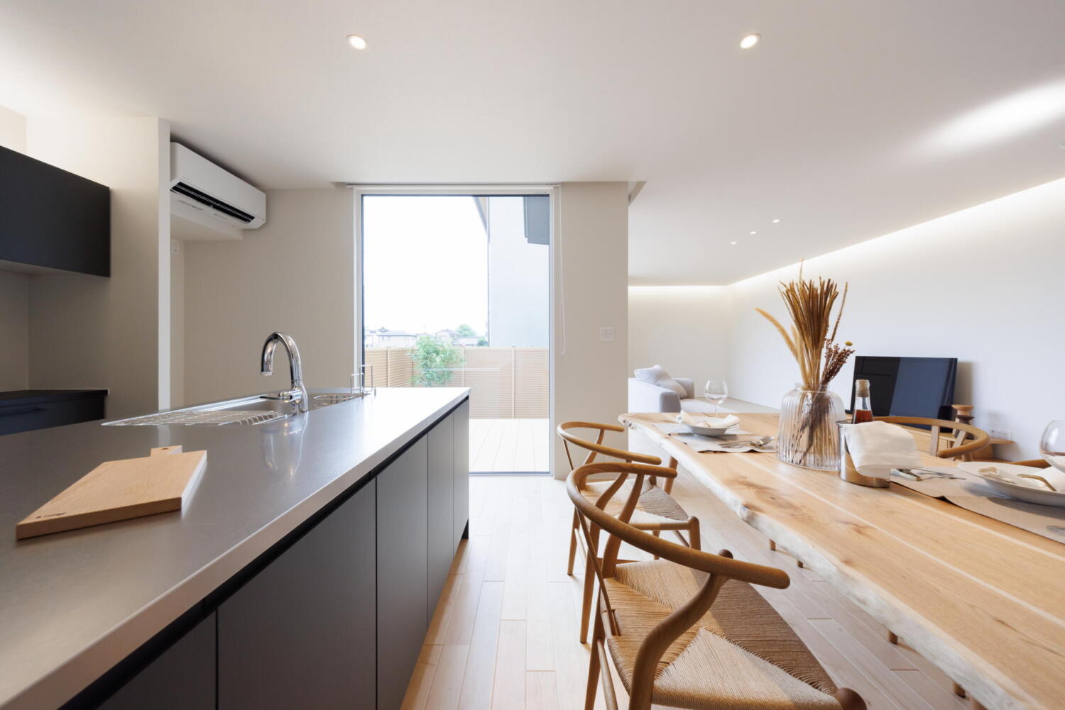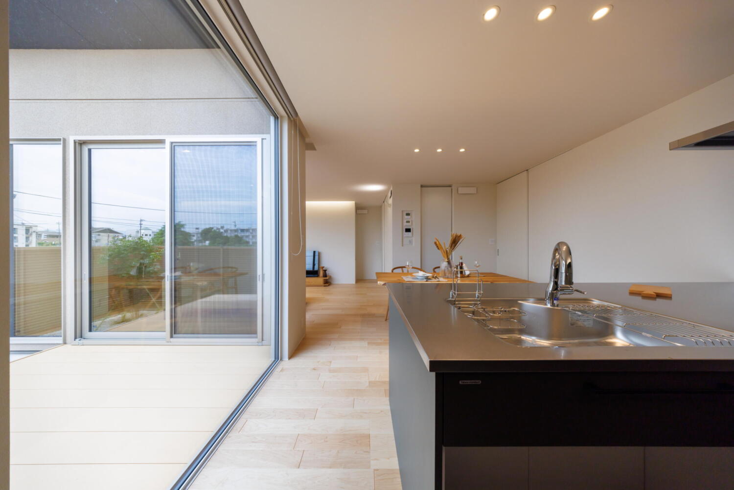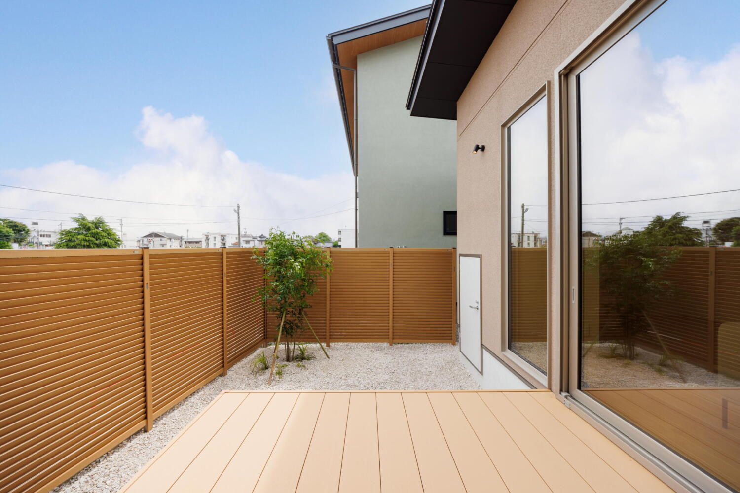 大きな掃き出し窓の先には中庭のウッドデッキが広がり、内と外がつながる開放的な設計です。