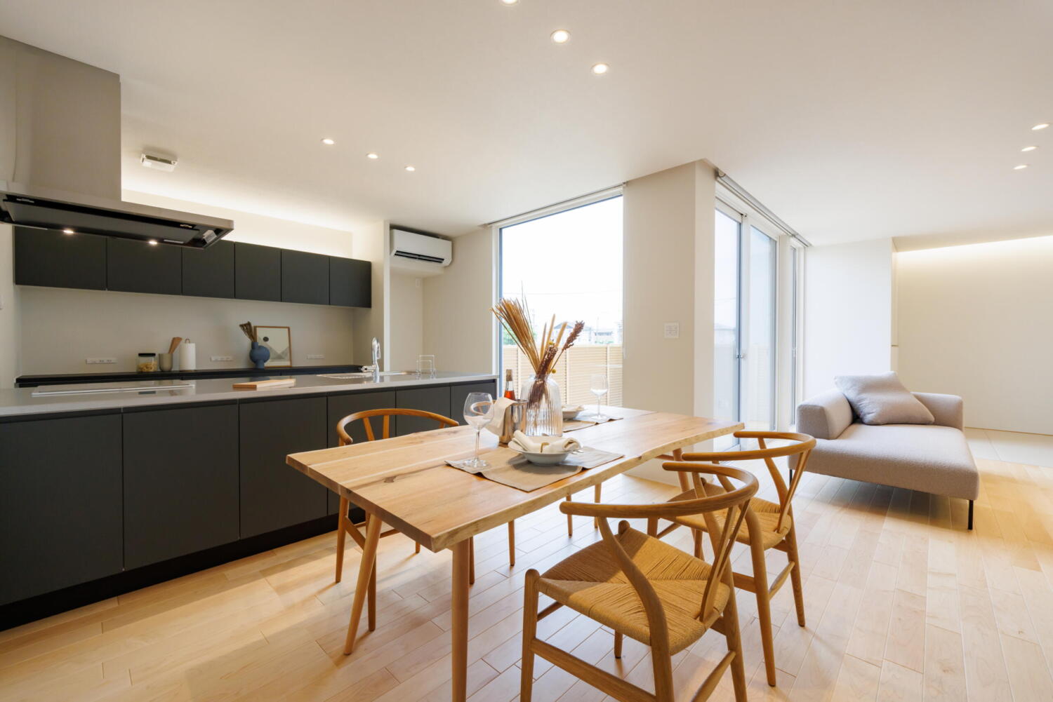 天井の間接照明が穏やかな陰影をつくり、日中も夜も落ち着きのある時間を演出します。
