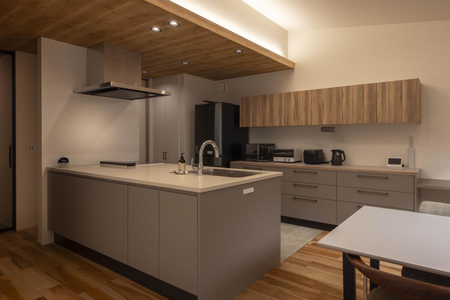 淡い空間の中で、静かに存在感を放つキッチンです。